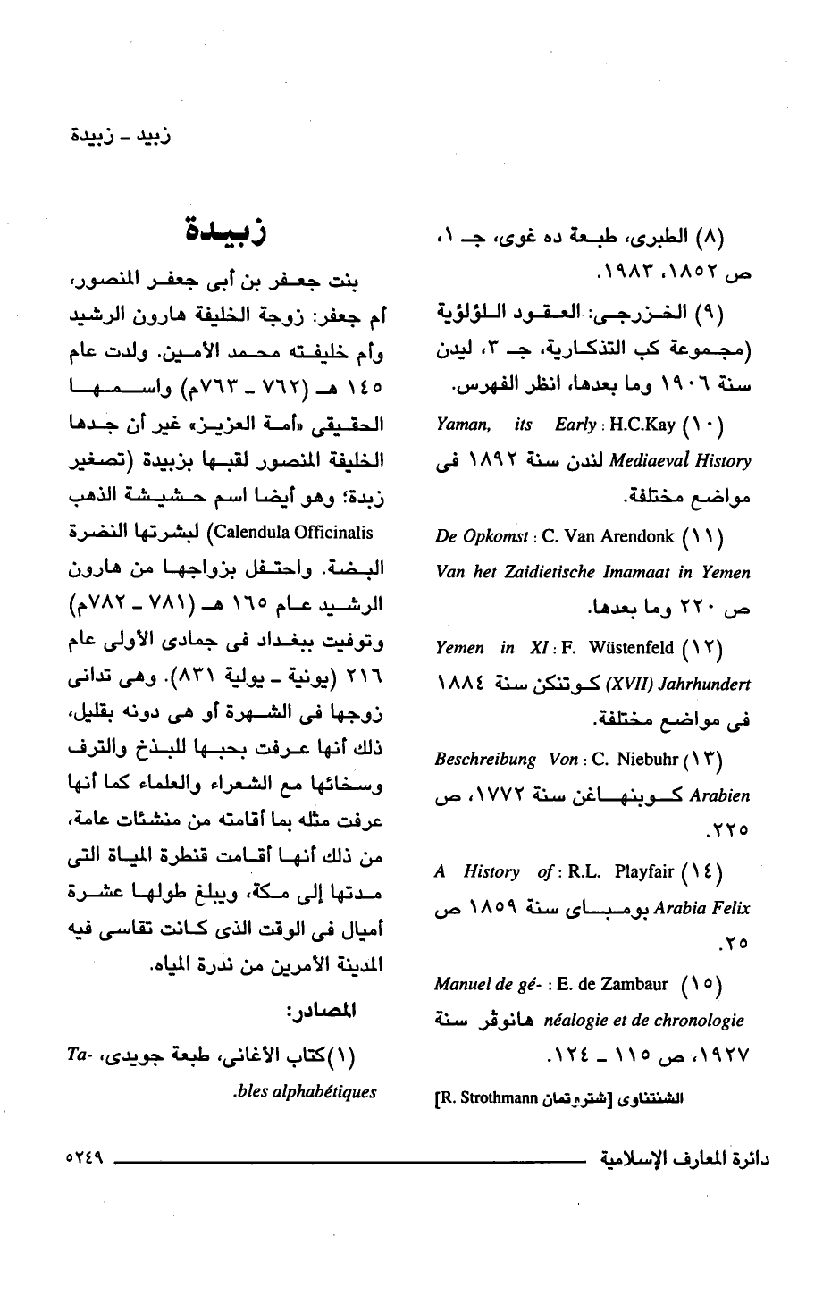 بنت جعفر بن أبى جعفر المنصور، أم جعفر: زوجة الخليفة هارون الرشيد وأم خليفته محمد الأمين. ولدت عام 145 هـ (762 - 763 م) واسمها الحقيقى "أمة العزيز" غير أن جدها الخليفة المنصور لقبها بزبيدة (تصغير زبدة؛ وهو أيضا اسم حشيشة الذهب Calendula Officinalis) لبشرتها النضرة البضة. واحتفل بزواجها من هارون الرشيد, 165 هـ (781 - 782 م) وتوفيت ببغداد فى جمادى الأولى عام 216 (يونية - يولية 831). وهى تدانى زوجها فى الشهرة أو هى دونه بقليل، ذلك أنها عرفت بحبها للبذخ والترف وسخائها مع الشعراء والعلماء كما أنها عرفت مثله بما أقامته من منشئات عامة، من ذلك أنها أقامت قنطرة المياه التى مدتها إلى مكة، ويبلغ طولها عشرة أميال فى الوقت الذى كانت تقاسى فيه المدينة الأمرين من ندرة المياه.