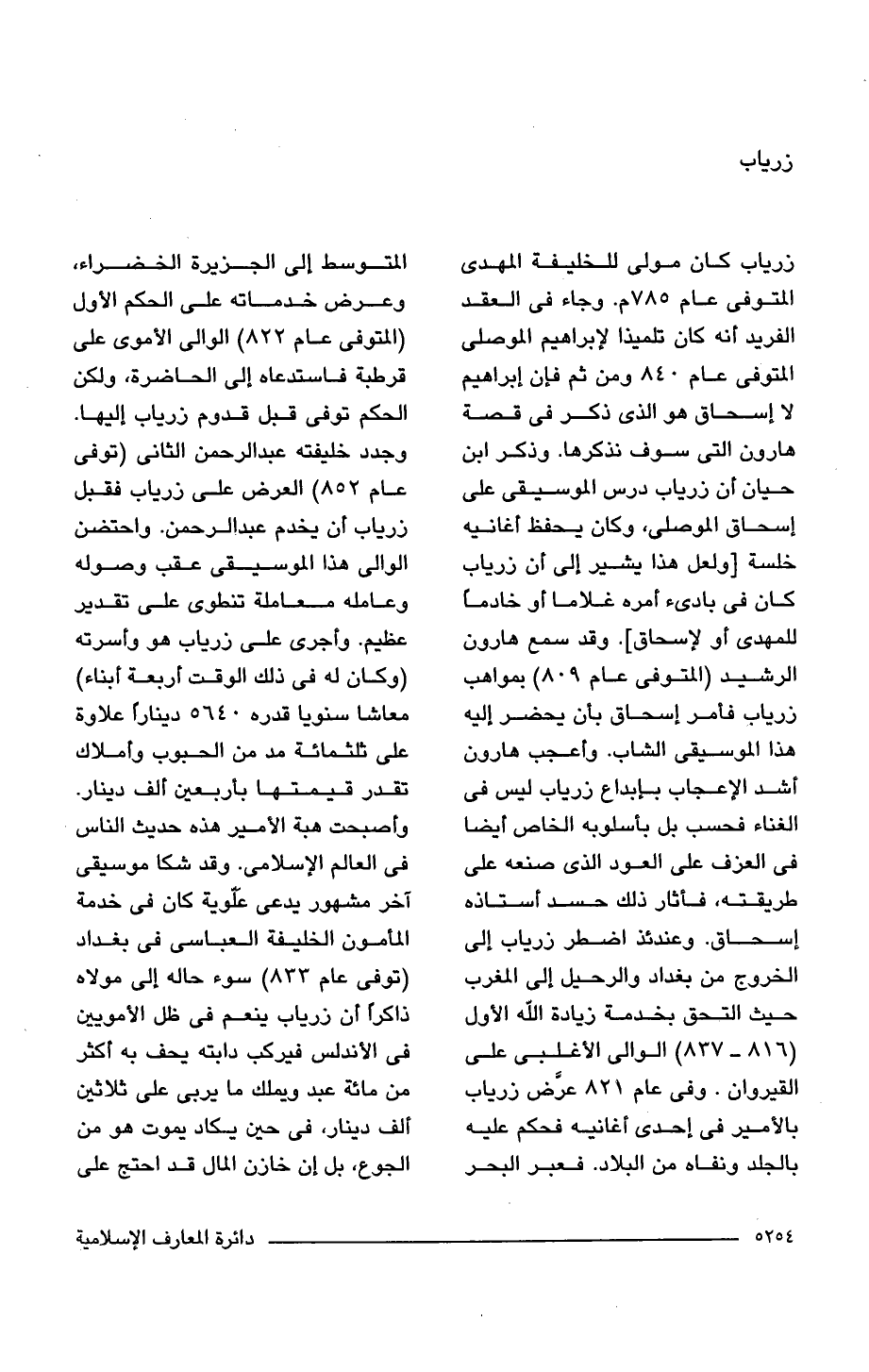 زرياب كان مولى للخليفة المهدى المتوفى عام 785 م. وجاء فى العقد الفريد أنه كان تلميذا لإبراهيم الموصلى المتوفى عام 840 ومن ثم فإن إبراهيم لا إسحاق هو الذى ذكر فى قصة هارون التى سوف نذكرها. وذكر ابن حيان أن زرياب درس الموسيقى على إسحاق الموصلى، وكان يحفظ أغانيه خلسة [ولعل هذا يشير إلى أن زرياب كان فى بادئ أمره غلامًا أو خادمًا للمهدى أو لإسحاق]. وقد سمع هارون الرشيد (المتوفى عام 809) بمواهب زرياب فأمر إسحاق بأن يحضر إليه هذا الموسيقى الشاب. وأعجب هارون أشد الإعجاب بإبداع زرياب ليس فى الغناء فحسب بل بأسلوبه الخاص أيضا فى العزف على العود الذى صنعه على طريقته، فأثار ذلك حسد أستاذه إسحاق. وعندئذ اضطر زرياب إلى الخروج من بغداد والرحيل إلى المغرب حيث التحق بخدمة زيادة اللَّه الأول (816 - 837) الوالى الأغلبى على القيروان. وفى عام 821 عرَّض زرياب بالأمير فى إحدى أغانيه فحكم عليه بالجلد ونفاه من البلاد. فعبر البحر المتوسط إلى الجزيرة الخضراء، وعرض خدماته على الحكم الأول (المتوفى 822) الوالى الأموى على قرطبة فاستدعاه إلى الحاضرة، ولكن الحكم توفى قبل قدوم زرياب إليها. وجدد خليفته عبد الرحمن الثانى (توفى عام 852) العرض على زرياب فقبل زرياب أن يخدم عبد الرحمن. واحتضن الوالى هذا الموسيقى عقب وصوله وعامله معاملة تنطوى على تقدير عظيم. وأجرى على زرياب هو وأسرته (وكان له فى ذلك الوقت أربعة أبناء) معاشا سنويا قدره 5640 دينارًا علاوة على ثلثمائة مد من الحبوب وأملاك تقدر قيمتها بأربعين ألف دينار. وأصبحت هبة الأمير هذه حديث الناس فى العالم الإسلامى. وقد شكا موسيقى آخر مشهور يدعى علوية كان فى خدمة المأمون الخليفة العباسى فى بغداد (توفى عام 832) سوء حاله إلى مولاه ذاكرًا أن زرياب ينعم فى ظل الأمويين فى الأندلس فيركب دابته يحف به أكثر من مائة عبد ويملك ما يربى على ثلاثين ألف دينار، فى حين يكاد يموت هو من الجوع، بل إن خازن المال قد احتج على
