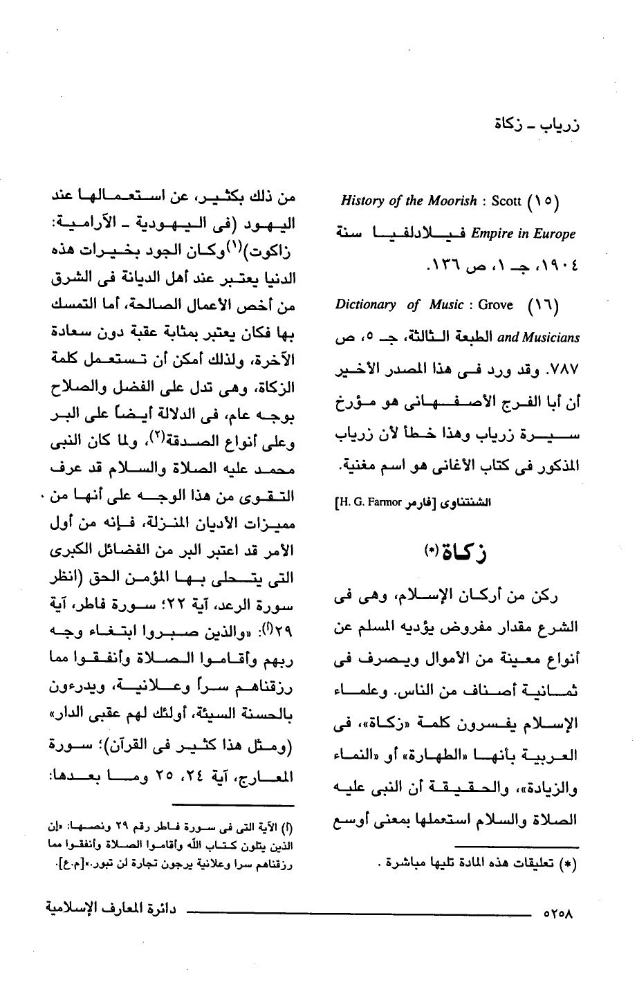 (16) Dictionary of Music and Musicians: Grove الطبعة الثالثة، جـ 5، ص 787. وقد ورد فى هذا المصدر الأخير أن أبا الفرج الأصفهانى هو مؤرخ سيرة زرياب وهذا خطأ لأن زرياب المذكور فى كتاب الأغانى هو اسم مغنية.