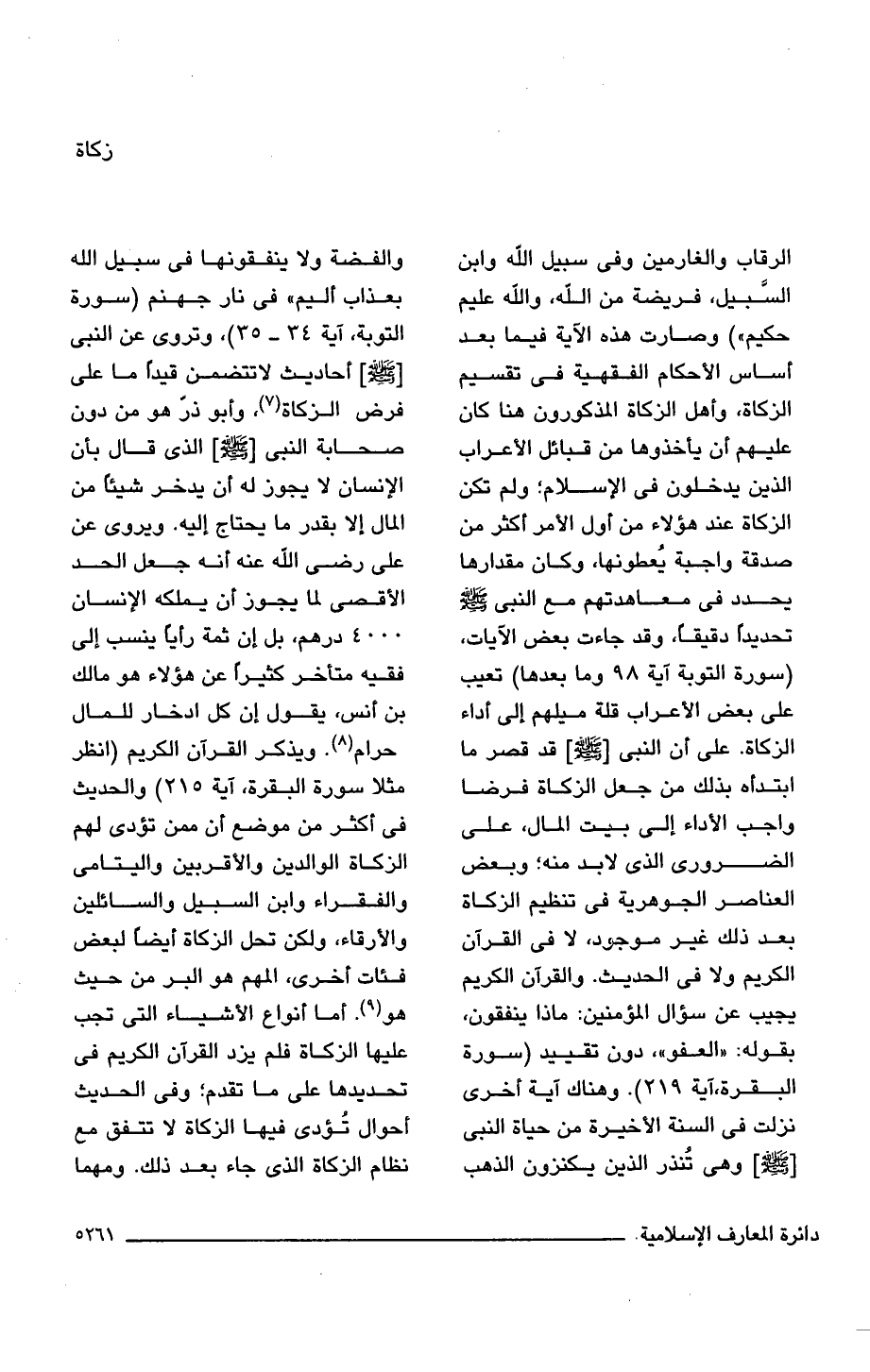 الرِّقَابِ وَالْغَارِمِينَ وَفِي سَبِيلِ اللَّهِ وَابْنِ السَّبِيلِ فَرِيضَةً مِنَ اللَّهِ وَاللَّهُ عَلِيمٌ حَكِيمٌ}) وصارت هذه الآية فيما بعد أساس الأحكام الفقهية فى تقسيم الزكاة، وأهل الزكاة المذكورون هنا كان عليهم أن يأخذوها من قبائل الأعراب الذين يدخلون فى الإسلام؛ ولم تكن الزكاة عند هؤلاء من أول الأمر أكثر من صدقة واجبة يُعطونها، وكان مقدارها يحدد فى معاهدتهم مع النبى -صلى اللَّه عليه وسلم- تحديدًا دقيقًا، وقد جاءت بعض الآيات، (سورة التوبة آية 98 وما بعدها) تعيب على بعض الأعراب قلة ميلهم إلى أداء الزكاة. على أن النبى [-صلى اللَّه عليه وسلم-] قد قصر ما ابتدأه بذلك من جعل الزكاة فرضا واجب الأداء إلى بيت المال، على الضرورى الذى لابد منه؛ وبعض العناصر الجوهرية فى تنظيم الزكاة بعد ذلك غير موجود، لا فى القرآن الكريم ولا فى الحديث. والقرآن الكريم يجيب عن سؤال المؤمنين: ماذا ينفقون، بقوله "العفو"، دون تقييد (سورة البقرة، آية 219). وهناك آية أخرى نزلت فى السنة الأخيرة من حياة النبى [-صلى اللَّه عليه وسلم-] وهى تُنذر الذين يكنزون الذهب والفضة ولا ينفقونها فى سبيل اللَّه بعذاب أليم في فى نار جهنم (سورة التوبة، آية 34 - 35)، وتروى عن النبى [-صلى اللَّه عليه وسلم-] أحاديث لا تتضمن قيدًا ما على فرض الزكاة (7)، وأبو ذرّ هو من دون صحابة النبى [-صلى اللَّه عليه وسلم-] الذى قال بأن الإنسان لا يجوز له أن يدخر شيئًا من المال إلا بقدر ما يحتاج إليه. ويروى عن على رضى اللَّه عنه أنه جعل الحد الأقصى لما يجوز أن يملكه الإنسان 4000 درهم، بل إن ثمة رأيا ينسب إلى فقيه متأخر كثيرًا عن هؤلاء هو مالك بن أنس، يقول إن كل ادخار للمال حرام (8). ويذكر القرآن الكريم (انظر مثلا سورة البقرة، آية 215) والحديث فى أكثر من موضع أن ممن تؤدى لهم الزكاة الوالدين والأقربين واليتامى والفقراء وابن السبيل والسائلين والأرقاء، ولكن تحل الزكاة أيضًا لبعض فئات أخرى، المهم هو البر من حيث هو (9). أما أنواع الأشياء التى تجب عليها الزكاة فلم يزد القرآن الكريم فى تحديدها على ما تقدم؛ وفى الحديث أحوال تُؤدى فيها الزكاة لا تتفق مع نظام الزكاة الذى جاء بعد ذلك. ومهما