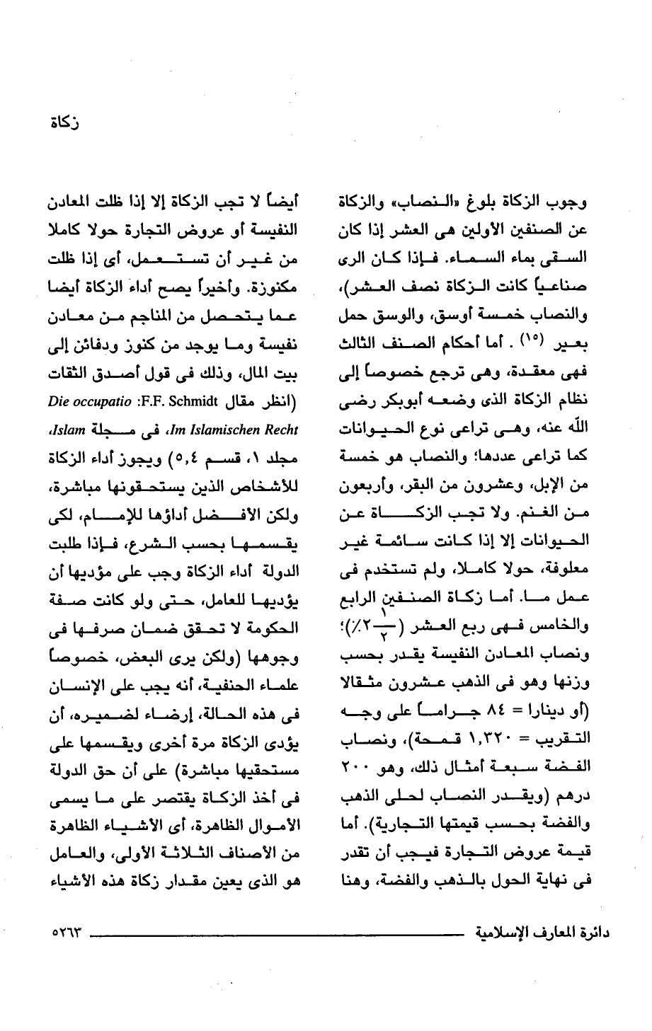 وجوب الزكاة بلوغ "النصاب" والزكاة عن الصنفين الأولين هى العشر إذا كان السقى بماء السماء. فإذا كان الرى صناعيًا كانت الزكاة نصف العشر)، والنصاب خمسة أوسق، والوسق حمل بعير (15). أما أحكام المصنف الثالث فهى معقدة، وهى ترجع خصوصًا إلى نظام الزكاة الذى وضعه أبو بكر رضى اللَّه عنه، وهى تراعى نوع الحيوانات كما تراعى عددها؛ والنصاب هو خمسة من الإبل، وعشرون من البقر، وأربعون من الغنم. ولا تجب الزكاة عن الحيوانات إلا إذا كانت سائمة غير معلوفة، حولا كاملا، ولم تستخدم فى عمل ما. أما زكاة الصنفين الرابع والخامس فهى ربع العشر 2.5 %)؛ ونصاب المعادن النفيسة يقدر بحسب وزنها وهو فى الذهب عشرون مثقالا (أو دينارا = 84 جرامًا على وجه التقريب = 1.320 قمحة)، ونصاب الفضة سبعة أمثال ذلك، وهو 200 درهم (ويقدر النصاب لحلى الذهب والفضة بحسب قيمتها التجارية). أما قيمة عروض التجارة فيجب أن تقدر فى نهاية الحول بالذهب والفضة، وهنا أيضًا لا تجب الزكاة إلا إذا ظلت المعادن النفيسة أو عروض التجارة حولا كاملا من غير أن تستعمل، أى إذا ظلت مكنوزة. وأخيرًا يصح أداء الزكاة أيضا عما يتحصل من المناجم من معادن نفيسة وما يوجد من كنوز ودفائن إلى بيت المال، وذلك فى قول أصدق الثقات (انظر مقال Die occupatio Im Islamischen Rechl: F.F.Schmidt، فى مجلة Islam، مجلد 1، قسم 4، 5) ويجوز أداء الزكاة للأشخاص الذين يستحقونها مباشرة، ولكن الأفضل أداؤها للإمام، لكى يقسمها بحسب الشرع، فإذا طلبت الدولة أداء الزكاة وجب على مؤديها أن يؤديها للعامل، حتى ولو كانت صفة الحكومة لا تحقق ضمان صرفها فى وجوهها (ولكن يرى البعض، خصوصًا علماء الحنفية، أنه يجب على الإنسان فى هذه الحالة، إرضاء لضميره، أن يؤدى الزكاة مرة أخرى ويقسمها على مستحقيها مباشرة) على أن حق الدولة فى أخذ الزكاة يقتصر على ما يسمى الأموال الظاهرة، أى الأشياء الظاهرة من الأصناف الثلاثة الأولى، والعامل هو الذى يعين مقدار زكاة هذه الأشياء