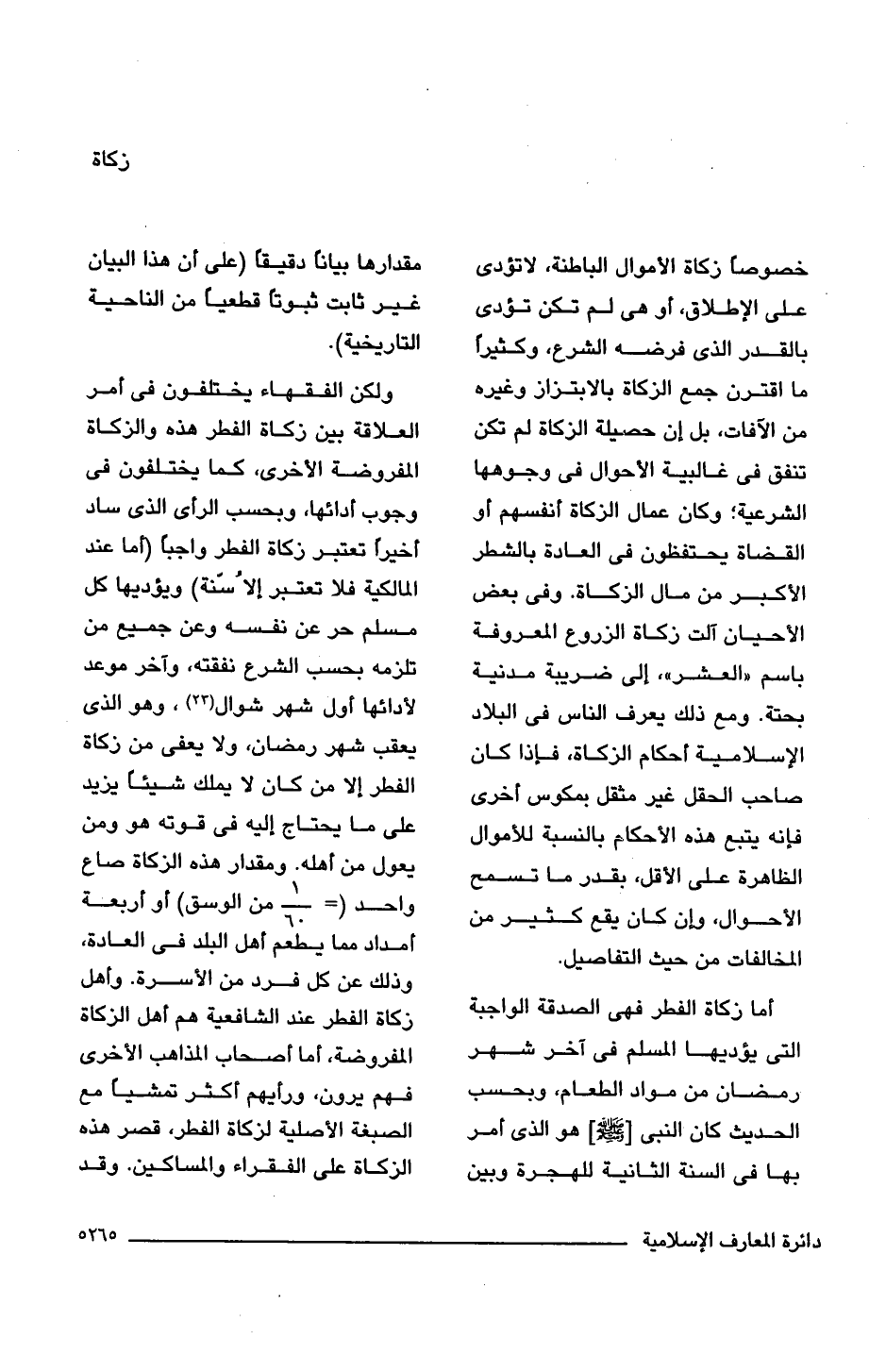 ولكن الفقهماء يختلفون فى أمر العلاقة بين زكاة الفطر هذه والزكاة المفروضة الأخرى، كما يختلفون فى وجوب أدائها، وبحسب الرأى الذى ساد أخيرًا تعتبر زكاة الفطر واجبًا (أما عند المالكية فلا تعتبر إلا سُنّة) ويؤديها كل مسلم حر عن نفسه وعن جميع من تلزمه بحسب الشرع نفقته، وآخر موعد لأدائها أول شهر شوال (23)، وهو الذى يعقب شهر رمضان، ولا يعفى من زكاة الفطر إلا من كان لا يملك شيئًا يزيد على ما يحتاج إليه فى قوته هو ومن يعول من أهله. ومقدار هذه الزكاة صاع واحد (= 1/ 60 من الوسق) أو أربعة أمداد مما يطعم أهل البلد فى العادة، وذلك عن كل فرد من الأسرة. وأهل زكاة الفطر عند الشافعية هم أهل الزكاة المفروضة، أما أصحاب المذاهب الأخرى فهم يرون، ورأيهم أكثر تمشيًا مع الصبغة الأصلية لزكاة الفطر، قصر هذه الزكاة على الفقراء والمساكين. وقد