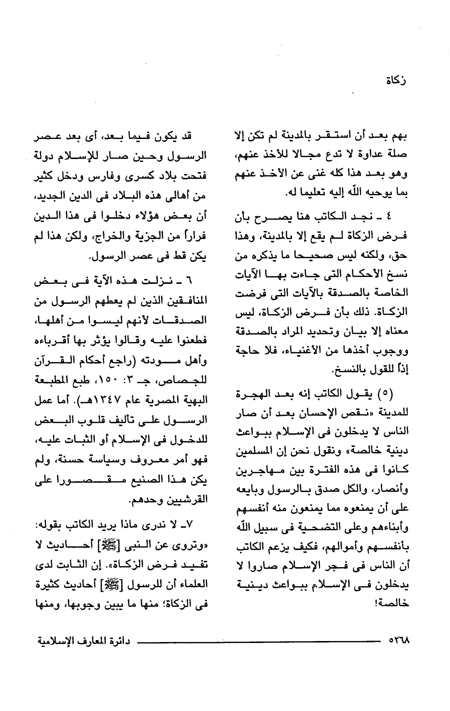 4 - نجد الكاتب هنا يصرح بأن فرض الزكاة لم يقع إلا بالمدينة، وهذا حق، ولكنه ليس صحيحا ما يذكره من نسخ الأحكام التى جاءت بها الآيات الخاصة بالصدقة بالآيات التى فرضت الزكاة. ذلك بأن فرض الزكاة، ليس معناه إلا بيان وتحديد المراد بالصدقة ووجوب أخذها من الأغنياء، فلا حاجة إذًا للقول بالنسخ.