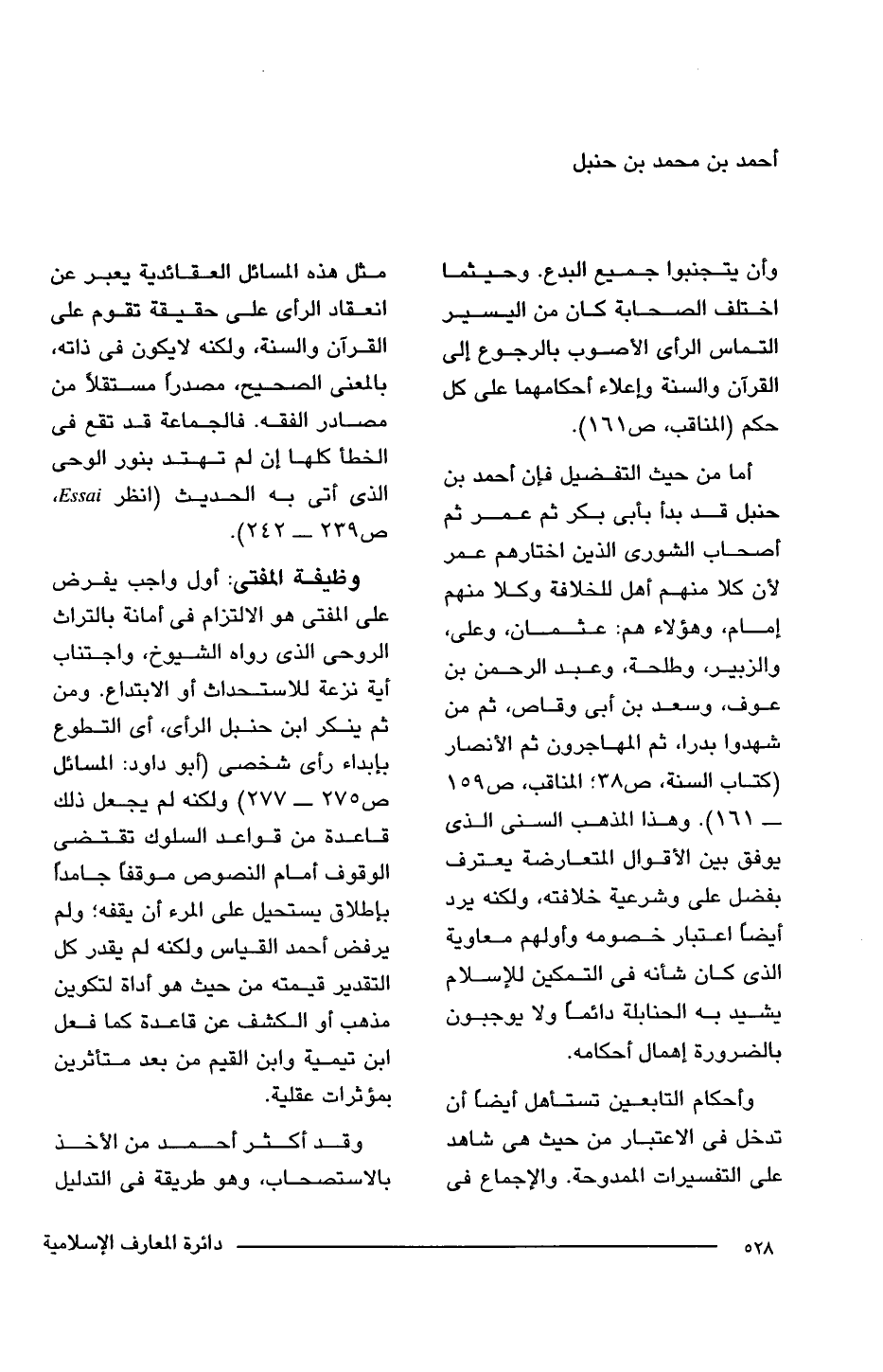 وأن يتجنبوا جميع البدع. وحيثما اختلف الصحابة كان من اليسير التماس الرأى الأصوب بالرجوع إلى القرآن والسنة وإعلاء أحكامهما على كل حكم (المناقب، ص 161).