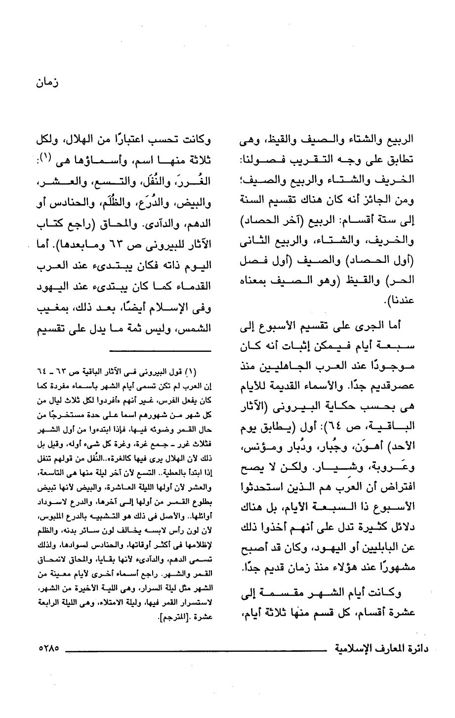 وكانت أيام الشهر مقسمة إلى عشرة أقسام، كل قسم منها ثلاثة أيام، وكانت تحسب اعتبارًا من الهلال، ولكل ثلاثة منها اسم، وأسماؤها هى (¬1): الغررَ، والنُفَل، والتسع، والعشر، والبيض، والدُرَع، والظُلَم، والحنادس أو الدهم، والدآدى. والمحاق (راجع كتاب الآثار للبيرونى ص 63 وما بعدها). أما اليوم ذاته فكان يبتدئ عند العرب القدماء كما كان يبتدئ عند اليهود وفى الإسلام أيضًا، بعد ذلك، بمغيب الشمس، وليس ثمة ما يدل على تقسيم