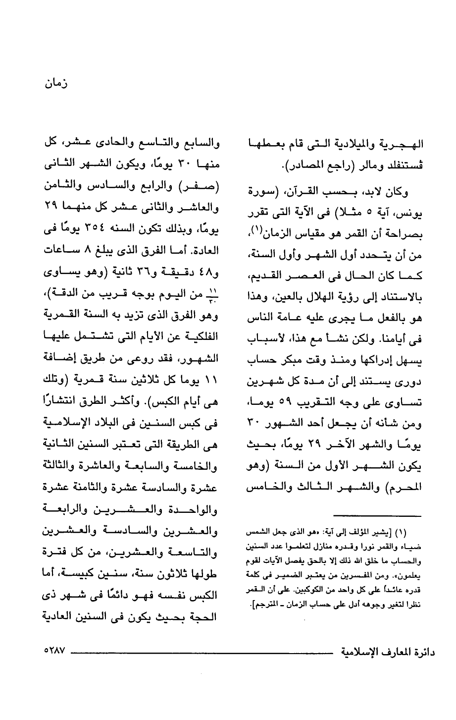 وكان لا بد، بحسب القرآن، (سورة يونس، آية 5 مثلا) فى الآية التى تقرر بصراحة أن القمر هو مقياس الزمان (¬1)، من أن يتحدد أول الشهر وأول السنة، كما كان الحال فى العصر القديم، بالاستناد إلى رؤية الهلال بالعين، وهذا هو بالفعل ما يجرى عليه عامة الناس فى أيامنا. ولكن نشأ مع هذا، لأسباب يسهل إدراكها ومنذ وقت مبكر حساب دورى يستند إلى أن مدة كل شهرين تساوى على وجه التقريب 59 يوما، ومن شأنه أن يجعل أحد الشهور 30 يومًا والشهر الآخر 29 يومًا، بحيث يكون الشهر الأول من السنة (وهو المحرم) والشهر الثالث والخامس والسابع والتاسع والحادى عشر، كل منها 30 يومًا، ويكون الشهر الثانى (صفر) والرابع والسادس والثامن والعاشر والثانى عشر كل منهما 29 يومًا، وبذلك تكون السنه 354 يومًا فى العادة. أما الفرق الذى يبلغ 8 ساعات و 48 دقيقة و 36 ثانية (وهو يساوى 11/ 30 من اليوم بوجه قريب من الدقة)، وهو الفرق الذى تزيد به السنة القمرية الفلكية عن الأيام التى تشتمل عليها الشهور، فقد روعى من طريق إضافة 11 يوما كل ثلاثين سنة قمرية (وتلك هى أيام الكبس). وأكثر الطرق انتشارًا فى كبس السنين فى البلاد الإسلامية هى الطريقة التى تعتبر السنين الثانية والخامسة والسابعة والعاشرة والثالثة عشرة والسادسة عشرة والثامنة عشرة والواحدة والعشرين والرابعة والعشرين والسادسة والعشرين والتاسعة والعشرين، من كل فترة طولها ثلاثون سنة، سنين كبيسة، أما الكبس نفسه فهو دائمًا فى شهر ذى الحجة بحيث يكون فى السنين العادية