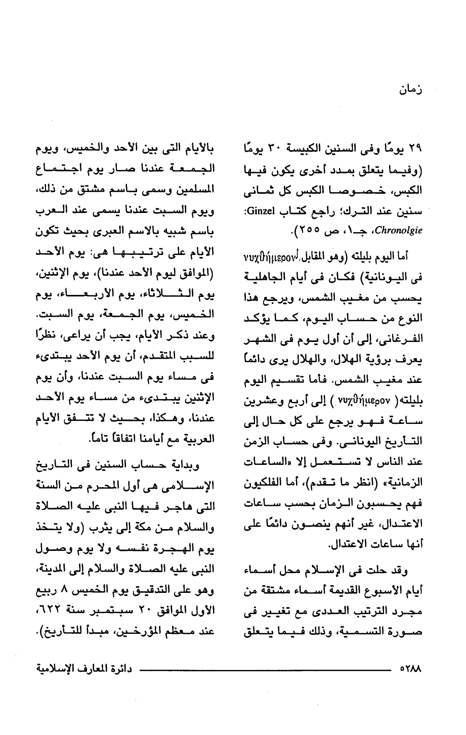 أما اليوم بليلته (وهو المقابل: فى اليونانية) فكان فى أيام الجاهلية يحسب من مغيب الشمس، ويرجع هذا النوع من حساب اليوم، كما يؤكد الفرغانى، إلى أن أول يوم فى الشهر يعرف برؤية الهلال، والهلال يرى دائمًا عند مغيب الشمس. فأما تقسيم اليوم بليلته () إلى أربع وعشرين ساعة فهو يرجع على كل حال إلى التأريخ اليونانى. وفى حساب الزمن عند الناس لا تستعمل إلا "الساعات الزمانية" (انظر ما تقدم)، أما الفلكيون فهم يحسبون الزمان بحسب ساعات الاعتدال، غير أنهم ينصون دائمًا على أنها ساعات الاعتدال.