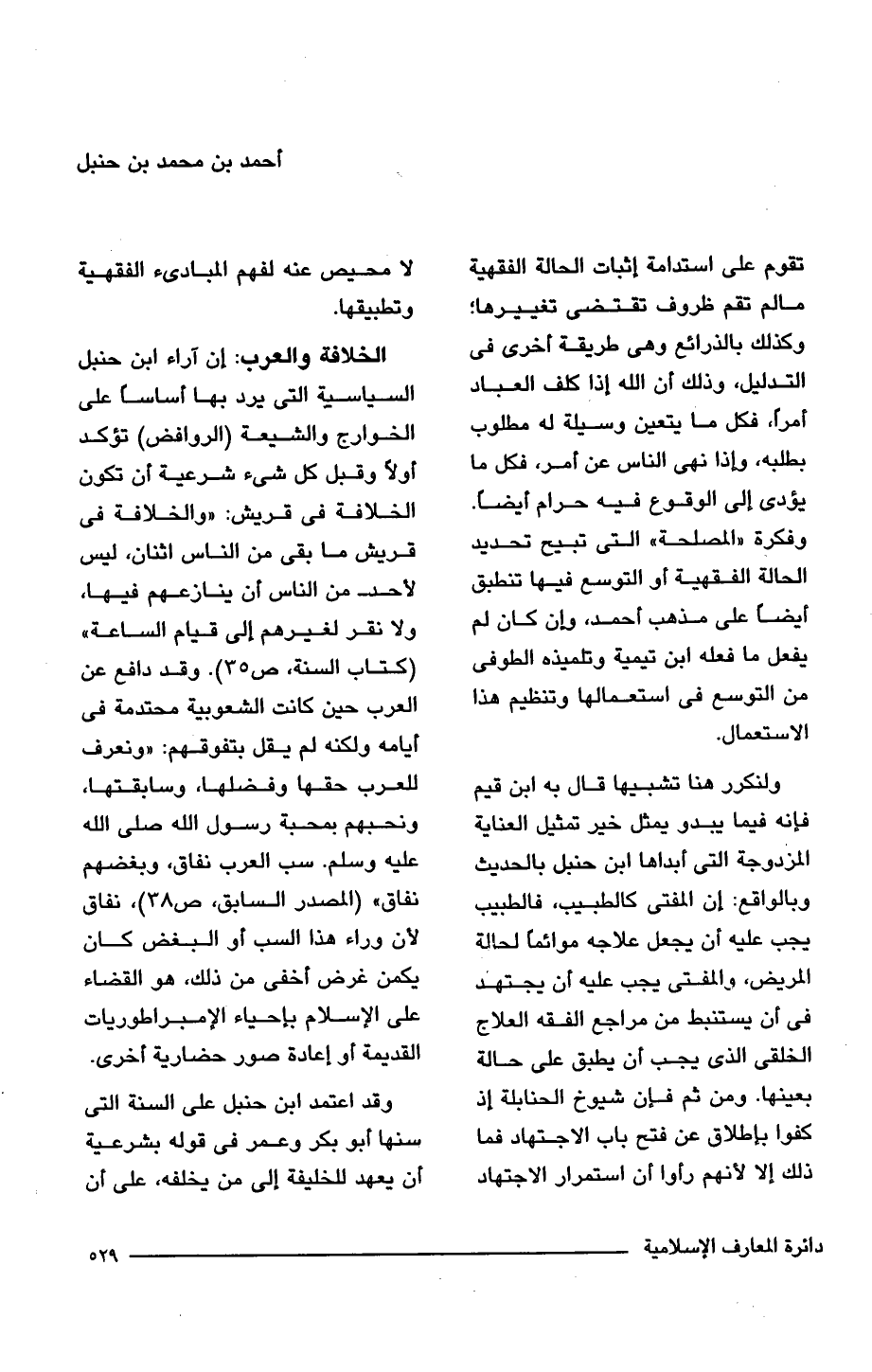 ولنكرر هنا تشبيها قال به ابن قيم فإنه فيما يبدو يملو خير تمثيل العناية المزدوجة التى أبداها ابن حنبل بالحديث وبالواقع: أن المفتى كالطبيب، فالطبيب يجب عليه أن يجعل علاجه موائمًا لحالة المريض, والمفتى يجب عليه أن يجتهد فى أن يستنبط من مراجع الفقه العلاج الخلقى الذى يجب أن يطبق على حالة بعينها. ومن ثم فإن شيوخ الحنابلة إذ كفوا بإطلاق عن فتح باب الاجتهاد فما ذلك إلا لأنهم رأوا أن استمرار الاجتهاد لا محيص عنه لفهم المبادئ الفقهية وتطبيقها.