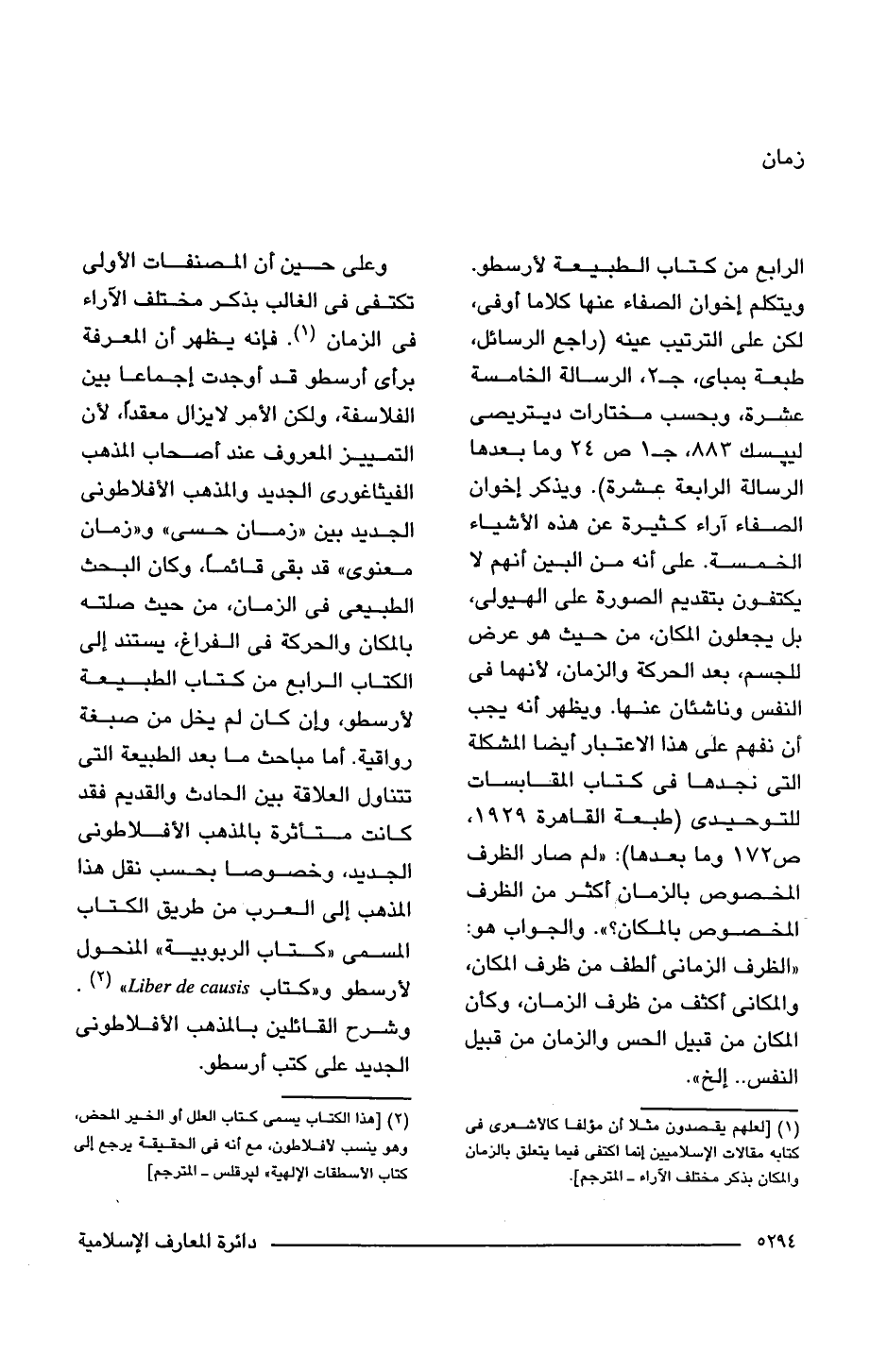 الرابع من كتاب الطبيعة لأرسطو. ويتكلم إخوان الصفاء عنها كلاما أوفى، لكن على الترتيب عينه (راجع الرسائل، طبعة بمباى، جـ 2، الرسالة الخامسة عشرة، وبحسب مختارات ديتريصى لييسك 883، جـ 1 ص 24 وما بعدها الرسالة الرابعة عشرة). ويذكر إخوان الصفاء آراء كثيرة عن هذه الأشياء الخمسة. على أنه من البين أنهم لا يكتفون بتقديم الصورة على الهيولى، بل يجعلون المكان، من حيث هو عرض للجسم، بعد الحركة والزمان، لأنهما فى النفس وناشئان عنها. ويظهر أنه يجب أن نفهم على هذا الاعتبار أيضا المشكلة التى نجدها فى كتاب المقابسات للتوحيدى (طبعة القاهرة 1929، ص 172 وما بعدها): "لم صار الظرف المخصوص بالزمان أكثر من الظرف المخصوص بالمكان؟ ". والجواب هو: "الظرف الزمانى ألطف من ظرف المكان، والمكانى أكثف من ظرف الزمان، وكأن المكان من قبيل الحس والزمان من قبيل النفس. . إلخ".