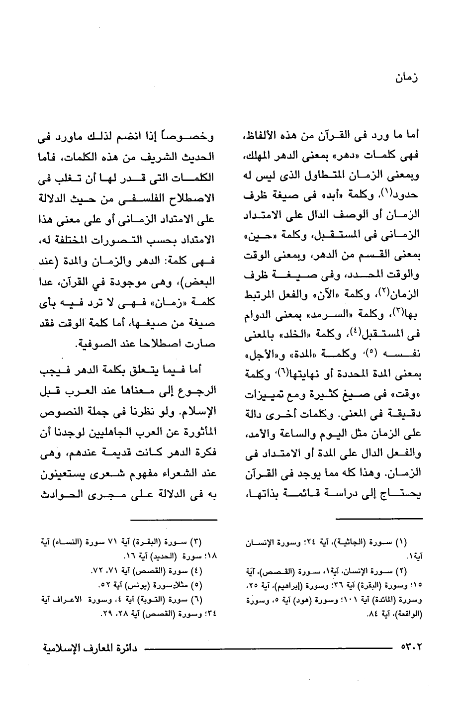 أما ما ورد فى القرآن من هذه الألفاظ، فهى كلمات "دهر" بمعنى الدهر المهلك، وبمعنى الزمان المتطاول الذى ليس له حدود (¬1)، وكلمة "أبد" فى صيغة ظرف الزمان أو الوصف الدال على الامتداد الزمانى فى المستقبل، وكلمة "حين" بمعنى القسم من الدهر، وبمعنى الوقت والوقت المحدد، وفى صيغة ظرف الزمان (¬2)، وكلمة "الآن" لفعل المرتبط بها (¬3)، وكلمة "السرمد" بمعنى الدوام فى المستقبل (¬4)، وكلمة "الخلد" بالمعنى نفسه (¬5)، وكلمة "المدة" و"الأجل" بمعنى المدة المحددة أو نهايتها (¬6)، وكلمة "وقت" فى صيغ كثيرة ومع تمييزات دقيقة فى المعنى. وكلمات أخرى دالة على الزمان مثل اليوم والساعة والأمد، والفعل الدال على المدة أو الامتداد فى الزمان. وهذا كله مما يوجد فى القرآن يحتاج إلى دراسة قائمة بذاتها، وخصوصًا إذا انضم لذلك ما ورد فى الحديث الشريف من هذه الكلمات، فأما الكلمات التى قدر لها أن تغلب فى الاصطلاح الفلسفى من حيث الدلالة على الامتداد الزمانى أو على معنى هذا الامتداد بحسب التصورات المختلفة له، فهى كلمة: الدهر والزمان والمدة (عند البعض)، وهى موجودة في القرآن، عدا كلمة "زمان" فهى لا ترد فيه بأى صيغة من صيغها، أما كلمة الوقت فقد صارت اصطلاحا عند الصوفية.