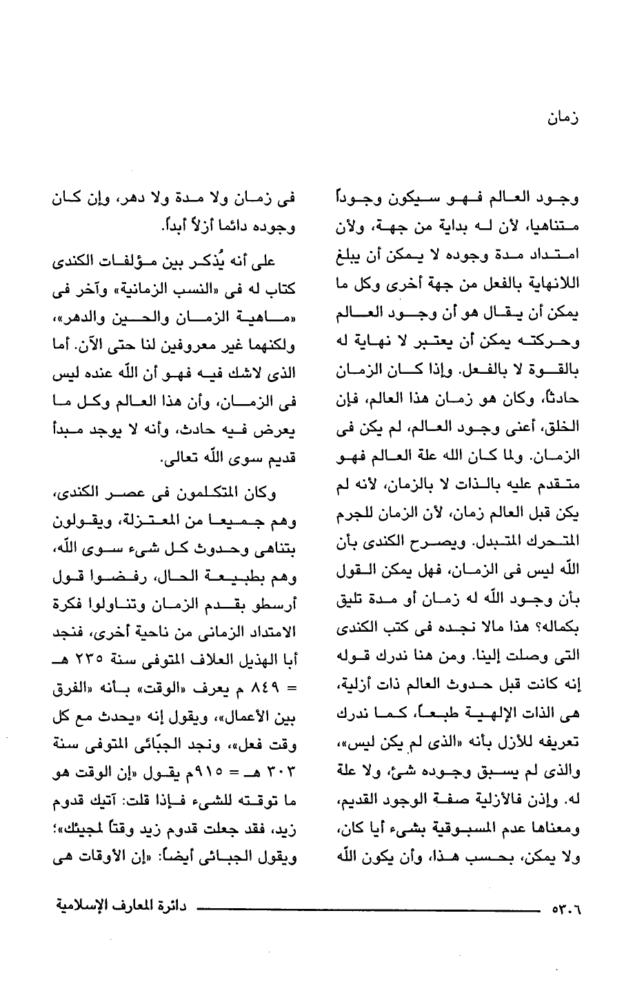 على أنه يُذكر بين مؤلفات الكندى كتاب له فى "النسب الزمانية" وآخر فى "ماهية الزمان والحين والدهر"، ولكنهما غير معروفين لنا حتى الآن. أما الذى لا شك فيه فهو أن اللَّه عنده ليس فى الزمان، وأن هذا العالم وكل ما يعرض فيه حادث، وأنه لا يوجد مبدأ قديم سوى اللَّه تعالى.