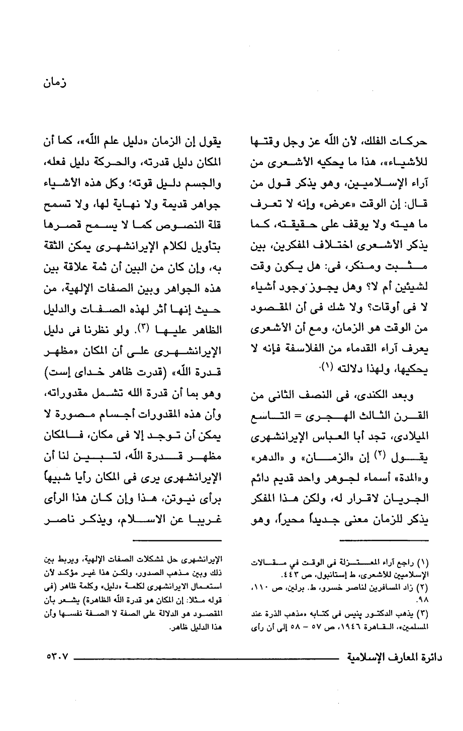وبعد الكندى، فى النصف الثانى من القرن الثالث الهجرى = التاسع الميلادى، تجد أبا العباس الإيرانشهرى يقول (¬2) إن "الزمان" و"الدهر" و"المدة" أسماء لجوهر واحد قديم دائم الجريان لا قرار له، ولكن هذا المفكر يذكر للزمان معنى جديدًا محيرًا، وهو يقول إن الزمان "دليل علم اللَّه"، كما أن المكان دليل قدرته، والحركة دليل فعله، والجسم دليل قوته؛ وكل هذه الأشياء جواهر قديمة ولا نهاية لها، ولا تسمح قلة النصوص كما لا يسمح قصرها بتأويل لكلام الإيرانشهرى يمكن الثقة به، وإن كان من البين أن ثمة علاقة بين هذه الجواهر وبين الصفات الإلهية، من حيث إنها أثر لهذه الصفات والدليل الظاهر عليها (¬3). ولو نظرنا فى دليل الإيرانشهرى على أن المكان "مظهر قدرة اللَّه" (قدرت ظاهر خداى إست) وهو بما أن قدرة اللَّه تشمل مقدوراته، وأن هذه المقدورات أجسام مصورة لا يمكن أن توجد إلا فى مكان، فالمكان مظهر قدرة اللَّه، لتبين لنا أن الإيرانشهرى يرى فى المكان رأيا شبيهًا برأى نيوتن، هذا وإن كان هذا الرأى غريبا عن الإسلام، ويذكر ناصر