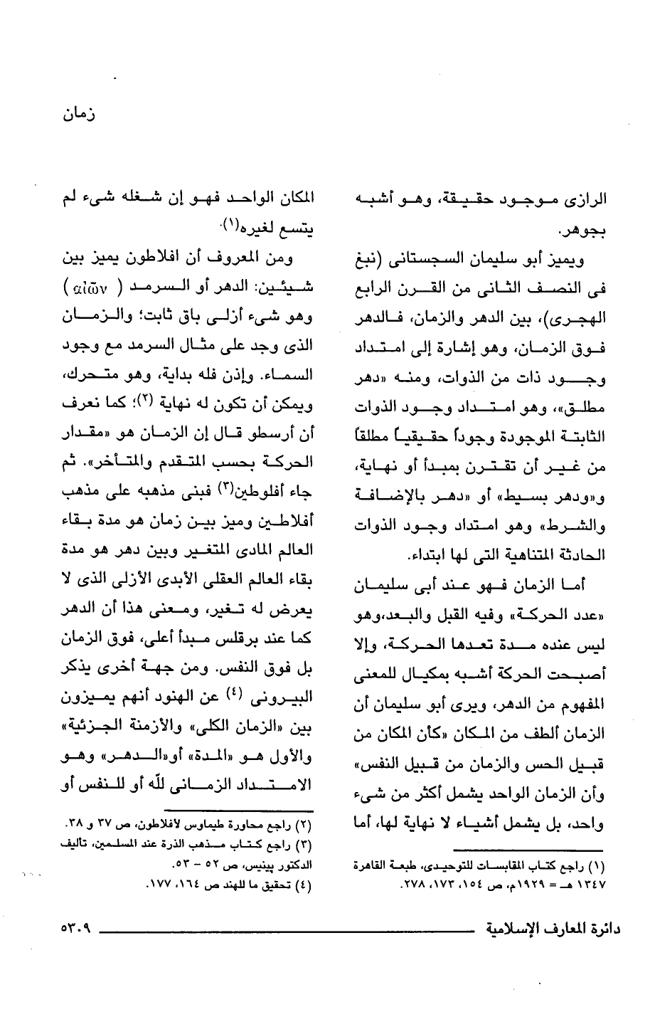 ومن المعروف أن افلاطون يميز بين شيئين: الدهر أو السرمد (. . .) وهو شئ أزلى باق ثابت؛ والزمان الذى وجد على مثال السرمد مع وجود السماء. وإذن فله بداية، وهو متحرك، ويمكن أن تكون له نهاية (¬2)؛ كما نعرف أن أرسطو قال إن الزمان هو "مقدار الحركة بحسب المتقدم والمتأخر". ثم جاء أفلوطين (¬3) فبنى مذهبه على مذهب أفلاطين وميز بين زمان هو مدة بقاء العالم المادى المتغير وبين دهر هو مدة بقاء العالم العقلى الأبدى الأزلى الذى لا يعرض له تغير، ومعنى هذا أن الدهر كما عند برقلس مبدأ أعلى، فوق الزمان بل فوق النفس. ومن جهة أخرى يذكر البيرونى (¬4) عن الهنود أنهم يميزون بين "الزمان الكلى" و"الأزمنة الجزئية" والأول هو "المدة" أو "الدهر" وهو الامتداد الزمانى للَّه أو للنفس أو