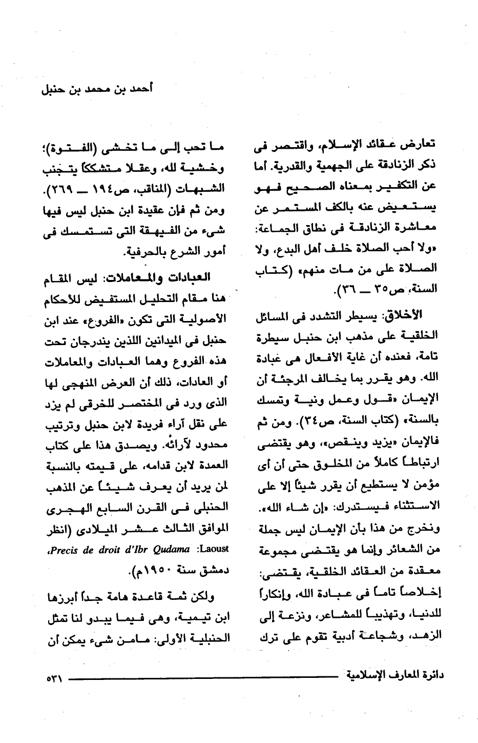 العبادات والمعاملات: ليس المقام - هنا مقام التحليل المستفيض للأحكام الأصولية التى تكون "الفروع" عند ابن حنبل فى الميدانين اللذين يندرجان تحت هذه الفروع وهما العبادات والمعاملات أو العادات، ذلك أن العرض المنهجى لها الذى ورد فى المختصر للخرقى لم يزد على نقل آراء فريدة لابن حنبل وترتيب محدود لأرائه. ويصدق هذا على كتاب العمدة لابن قدامه، على قيمته بالنسبة لمن يريد أن يعرف شيئًا عن المذهب الحنبلى فى القرن السابع الهجرى الموافق الثالث عشر الميلادى (انظر Precis de droit d lbr Qudama، دمشق سنة 1950 م).