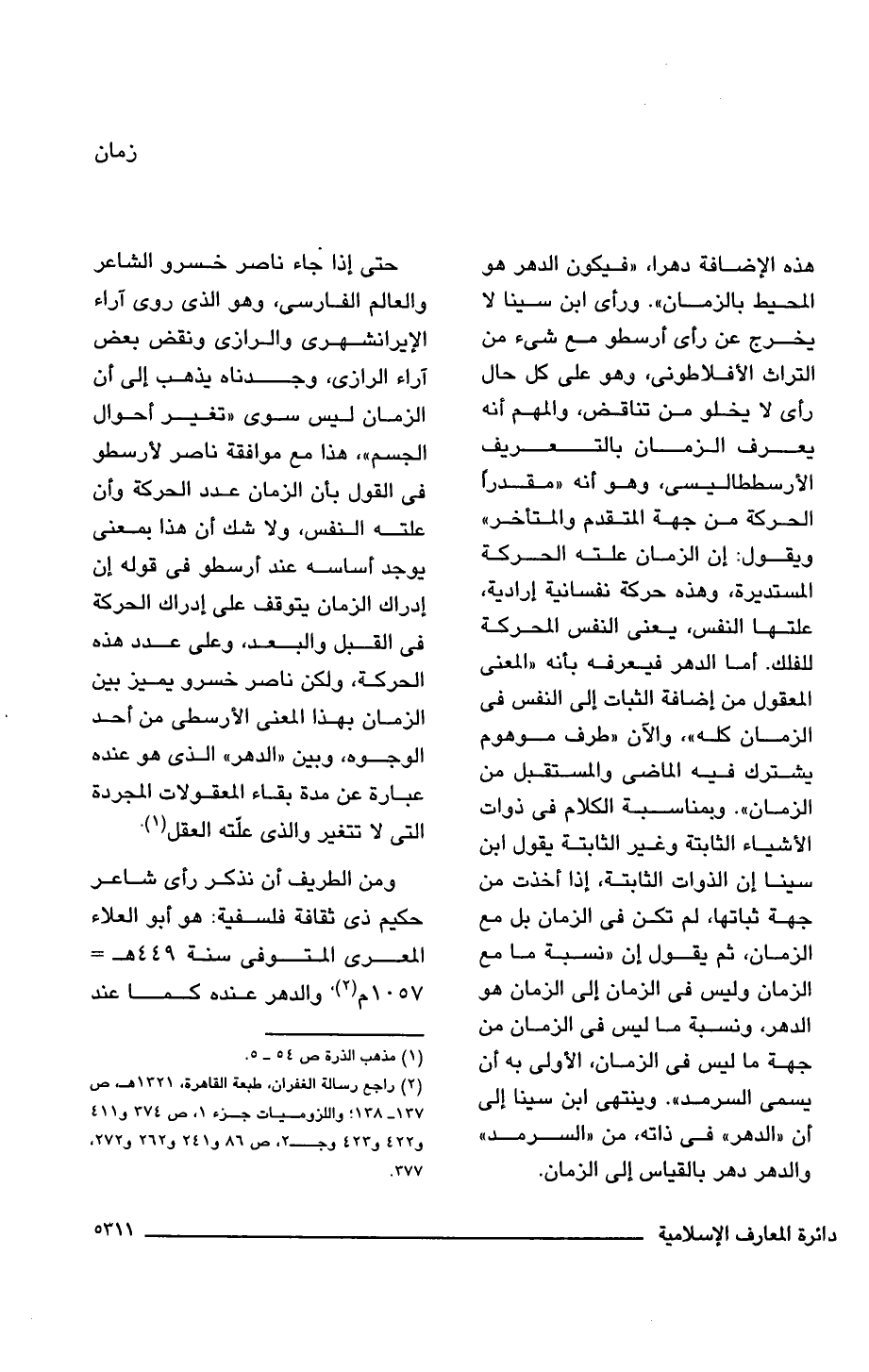 حتى إذا جاء ناصر خسرو الشاعر والعالم الفارسى، وهو الذى روى آراء الإيرانشهرى والرازى ونقض بعض آراء الرازى، وجدناه يذهب إلى أن الزمان ليس سوى "تغير أحوال الجسم"، هذا مع موافقة ناصر لأرسطو فى القول بأن الزمان عدد الحركة وأن علته النفس، ولا شك أن هذا بمعنى يوجد أساسه عند أرسطو فى قوله إن إدراك الزمان يتوقف على إدراك الحركة فى القبل والبعد، وعلى عدد هذه الحركة، ولكن ناصر خسرو يميز بين الزمان بهذا المعنى الأرسطى من أحد الوجوه، وبين "الدهر" الذى هو عنده عبارة عن مدة بقاء المعقولات المجردة التى لا تتغير والذى علّته العقل (¬1).