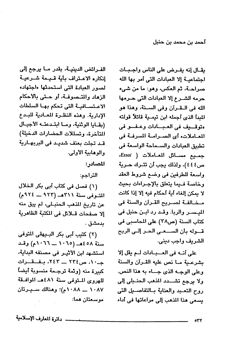 على أنه فى العبادات لم يقل إلا بشرعية ما نص عليه القرآن والسنة وعلى الوجه الذى جاء به هذا النص. ولا يرجع تشدد المذهب الحنبلى إلى روح التعبد والعناية بالتفاصيل التى يسعى هذا المذهب إلى مراعاتها فى أداء الفرائض الدينية، بقدر ما يرجع إلى إنكاره الاعتراف بأية قيمة شرعية لصور العبادة التى استحدثها "اجتهاد" الزهاد والمتصوفة، أو حتى بالأحكام الاعتسافية التى تحكم بها السلطات الإدارية. وهذه النظرة المعادية للبدع (بقايا الوثنية، وما ابتدعته الأجيال المتأخرة، وتسللات الحضارات الدخيلة) قد تجلت بعنف شديد فى البربهارية والوهابية الأولى.