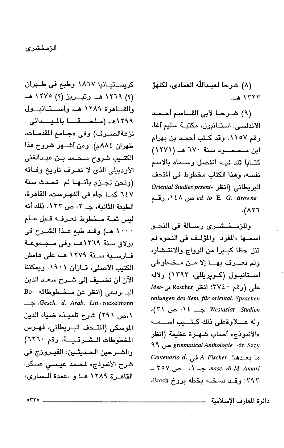 (9) شرحا لأبى القاسم أحمد الأندلسى، استانبول، مكتبة سليم أغا، رقم 1157. وقد كتب أحمد بن بهرام ابن محمود سنة 670 هـ (1271) كتابا قلد فيه المفصل وسماه بالاسم نفسه، وهذا الكتاب مخطوط فى المتحف البريطانى (انظر Oriental Studies prsented to E. G. Browne ص 148، رقم 826).