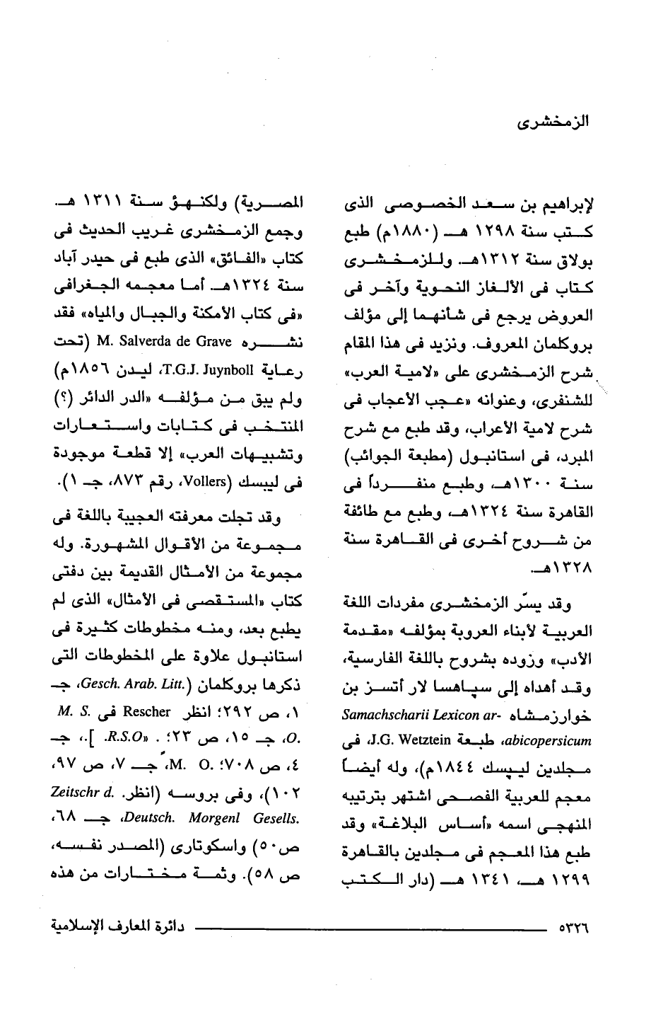 لإبراهيم بن سعد الخصوصى الذى كتب سنة 1298 هـ (1880 م) طبع بولاق سنة 1312 هـ. وللزمخشرى كتاب فى الألغاز النحوية وآخر فى العروض يرجع فى شأنهما إلى مؤلف بروكلمان المعروف. ونزيد فى هذا المقام شرح الزمخشرى على "لامية العرب" للشنفرى، وعنوانه "عجب الأعجاب فى شرح لامية الأعراب، وقد طبع مع شرح المبرد، فى استانبول (مطبعة الجوائب) سنة 1300 هـ، وطبع منفرد، فى القاهرة سنة 1324 هـ، وطبع مع طائفة من شروح أخرى فى القاهرة سنة 1328 هـ.