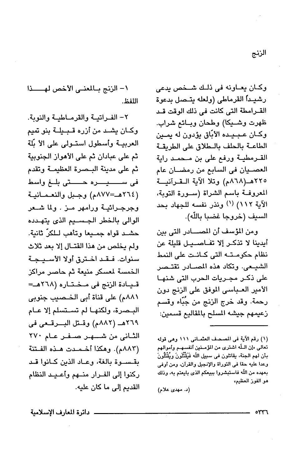 2 - الفراتية والقرماطية والنوبة. وكان يشد من أزره قبيلة بنو تميم العربية وأسطول استولى على الأبّلة ثم على عبادان ثم على الأهواز الجنوبية ثم على مدينة البصرة العظيمة وتقدم فى سيره حتى بلغ واسط (264 هـ = 877 م) وجبل والنعمانية وجرجرائية ورامهرمز. ولما شعر الوالى بالخطر الجسيم الذى يتهدده حشد قواه جميعا وتأهب للكرّ ثانية. ولم يخلص من هذا القتال إلا بعد ثلاث سنوات. فقد اخترق أولا الأسيجة الخمسة لمعسكر منيعة ثم حاصر مراكز قيادة الزنج فى مختاره (268 هـ = 881 م) على قناة أبى الخصيب جنوبى البصرة، ولكنها لم تستسلم إلا عام 269 هـ (882 م) وقتل البرقعى فى الثانى من شهر صفر عام 270 (883 م). وهكذا أخمدت هذه الفتنة بقسوة بالغة، وعاد الذين كانوا قد ركنوا إلى الفرار منهم وأعيد النظام القديم إلى ما كان عليه.