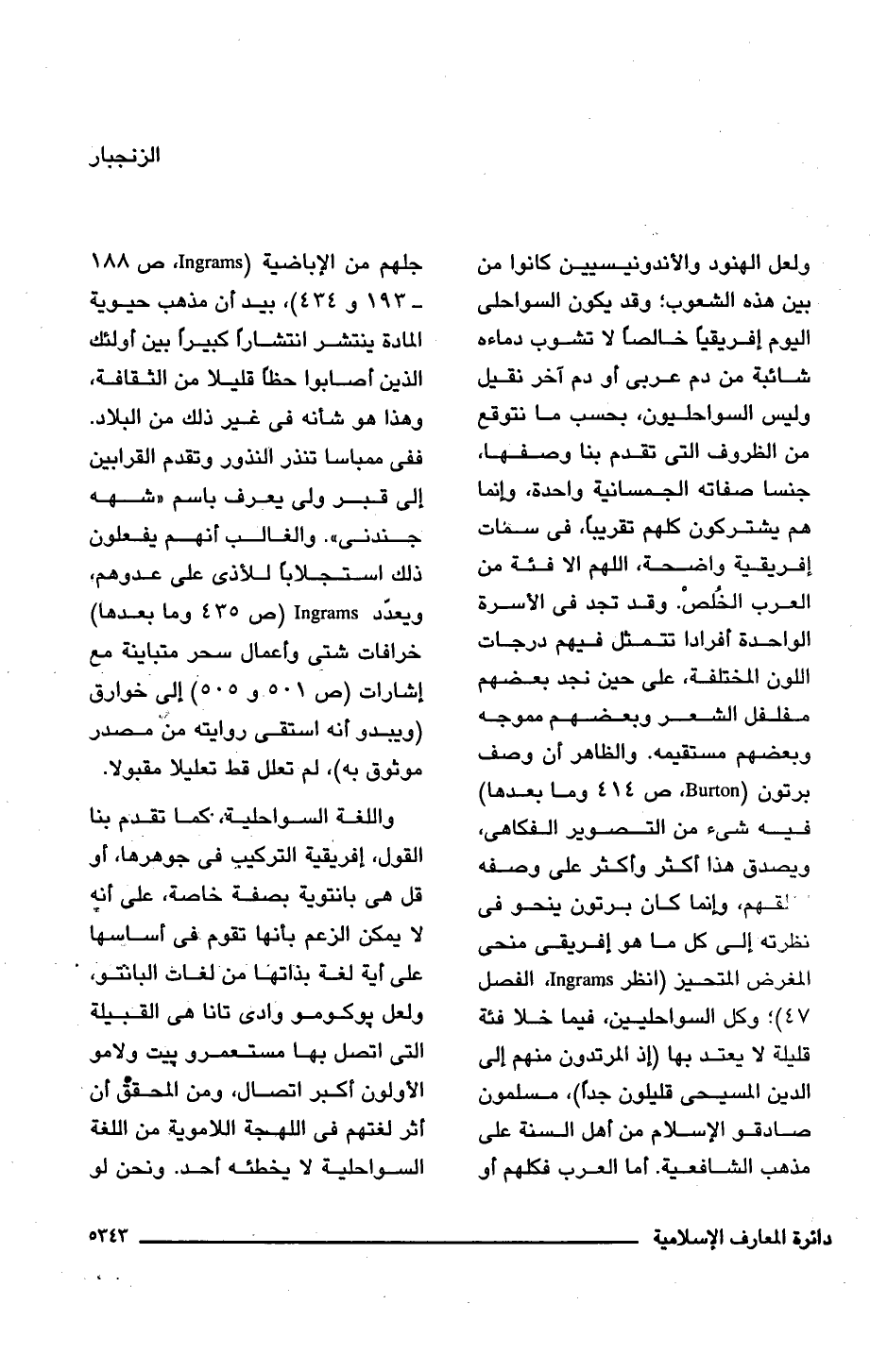 ولعل الهنود والأندونيسيين كانوا من بين هذه الشعوب؛ وقد يكون السواحلى اليوم إفريقيا خالصًا لا تشوب دماءه شائبة من دم عربى أو دم آخر نقيل وليس السواحليون، بحسب ما نتوقع من الظروف التى تقدم بنا وصفها، جنسا صفاته الجسمانية واحدة، وإنما هم يشتركون كلهم تقريبًا، فى سمات إفريقية واضحة، اللهم إلا فئة من العرب الخُلصْ. وقد تجد فى الأسرة الواحدة تتمثل فيهم درجات اللون المختلفة، على حين نجد بعضهم مفلفل الشعر وبعضهم مموجه وبعضهم مستقيمه. والظاهر أن وصف برتون (Burton، ص 414 وما بعدها) فيه شئ من التصوير الفكاهى، ويصدق هذا أكثر وأكثر على وصفه خلقهم، وإنما كان برتون ينحو فى نظرته إلى كل ما هو إفريقى منحى المغرض المتحيز (انظر Ingrains، الفصل 47)؛ وكل السواحليين، فيما خلا فئة قليلة لا يعتد بها (إذ المرتدون منهم إلى الدين المسيحى قليلون جدًا)، مسلمون صادقو الإسلام من أهل السنة على مذهب الشافعية. أما العرب فكلهم أو جلهم من الإباضية (Ingrams، ص 188 - 193 و 434)، بيد أن مذهب حيوية المادة ينتشر انتشارًا كبيرًا بين أولئك الذين أصابوا حظًا قليلا من الثقافة، وهذا هو شأنه فى غير ذلك من البلاد. ففى ممباسا تنذر النذور وتقدم القرابين إلى قبر ولى يعرف باسم "شهه جندنى". والغالب أنهم يفعلون ذلك استجلابًا للأذى على عدوهم، ويعدّد Ingrams (ص 435 وما بعدها) خرافات شتى وأعمال سحر متباينة مع إشارات (ص 501 و 505) إلى خوارق (ويبدو أنه استقى روايته من مصدر موثوق به)، لم تعلل قط تعليلا مقبولا.