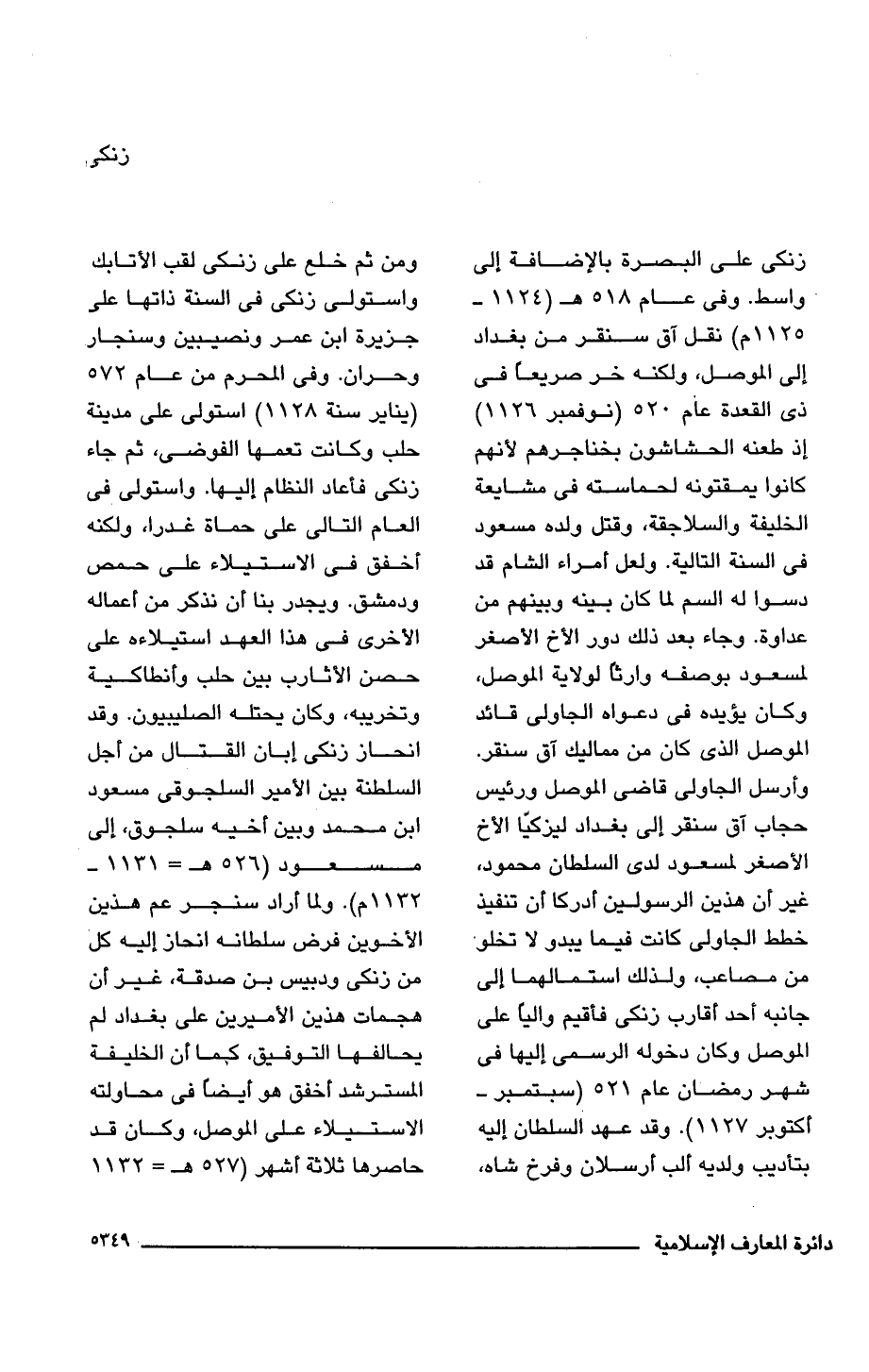 زنكى على البصرة بالإضافة إلى واسط. وفى عام 518 هـ (1124 - 1125 م) نقل آق سنقر من بغداد إلى الموصل، ولكنه خر صريعًا فى ذى القعدة عام 520 (نوفمبر 1126) إذ طعنه الحشاشون بخناجرهم لأنهم كانوا يمقتونه لحماسته فى مشايعة الخليفة والسلاجقة، وقتل ولده مسعود فى السنة التالية. ولعل أمراء الشام قد دسوا له السم لما كان بينه وبينهم من عداوة. وجاء بعد ذلك دور الأخ الأصغر لمسعود بوصفه وارثًا لولاية الموصل، وكان يؤيده فى دعواه الجاولى قائد الموصل الذى كان من مماليك آق سنقر. وأرسل الجاولى قاضى الموصل ورئيس حجاب آق سنقر إلى بغداد ليزكيّا الأخ الأصغر لمسعود لدى السلطان محمود، غير أن هذين الرسولين أدركا أن تنفيذ خطط الجاولى كانت فيما يبدو لا تخلو من مصاعب، ولذلك استمالهما الى جانبه أحد أقارب زنكى فأقيم واليًا على الموصل وكان دخوله الرسمى إليها فى شهر رمضان عام 521 (سبتمبر - أكتوبر 1127). وقد عهد السلطان إليه بتأديب ولديه ألب أرسلان وفرخ شاه، ومن ثم خلع على زنكى لقب الأتابك واستولى زنكى فى السنة ذاتها على جزيرة ابن عمر ونصيبين وسنجار وحران. وفى المحرم من عام 572 (يناير سنة 1128) استولى على مدينة حلب وكانت تعمها الفوضى، ثم جاء زنكى فأعاد النظام إليها. واستولى فى العام التالى على حماة غدرا، ولكنه أخفق فى الاستيلاء على حمص ودمشق. ويجدر بنا أن نذكر من أعماله الأخرى فى هذا العهد استيلاءه على حصن الأثارب بين حلب وأنطاكية وتخريبه، وكان يحتله الصليبيون. وقد انحاز زنكى إبان القتال من أجل السلطنة بين الأمير السلجوقى مسعود ابن محمد وبين أخيه سلجوق، إلى مسعود (526 هـ = 1131 - 1132 م). ولما أراد سنجر عم هذين الأخوين فرض سلطانه انحاز إليه كل من زنكى ودبيس بن صدقة، غير أن هجمات هذين الأميرين على بغداد لم يحالفها التوفيق، كما أن الخليفة المسترشد أخفق هو أيضًا فى محاولته الاستيلاء على الموصل، وكان قد حاصرها ثلاثة أشهر (527 هـ = 1132