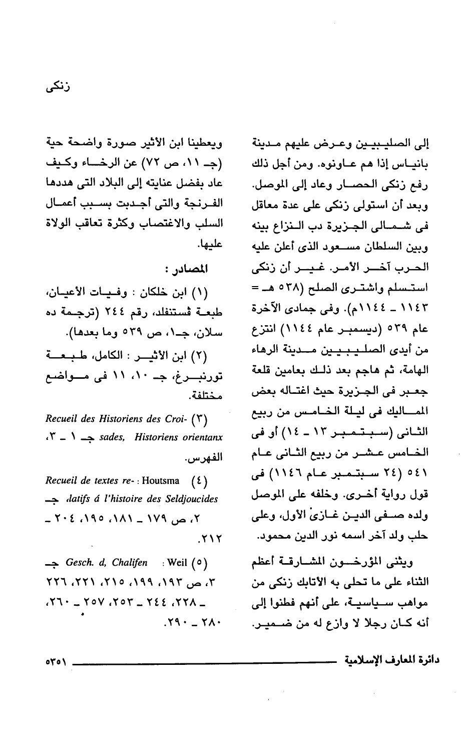 إلى الصليبيين وعرض عليهم مدينة بانياس إذا هم عاونوه. ومن أجل ذلك رفع زنكى الحصار وعاد إلى الموصل. وبعد أن استولى زنكى على عدة معاقل فى شمالى الجزيرة دب النزاع بينه وبين السلطان مسعود الذى أعلن عليه الحرب آخر الأمر. غير أن زنكى استسلم واشترى الصلح (538 هـ = 1143 - 1144 م). وفى جمادى الآخرة عام 539 (ديسمبر عام 1144) انتزع من أيدى الصليبيين مدينة الرهاء الهامة، ثم هاجم بعد ذلك بعامين قلعة جعبر فى الجزيرة حيث اغتاله بعض المماليك فى ليلة الخامس من ربيع الثانى (سبتمبر 13 - 14) أو فى الخامس عشر من ربيع الثانى عام 541 (24 سبتمبر عام 1146) في قول رواية أخرى. وخلفه على الموصل ولده صفى الدين غازى الأول، وعلى حلب ولد آخر اسمه نور الدين محمود.