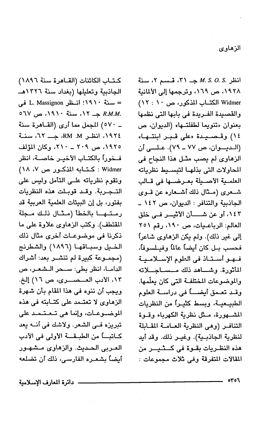 انظر. M.S.O.S جـ 31، قسم 2، سنة 1928، ص 169، وترجمها إلى الألمانية Widmer الكتاب المذكور، ص 10: 12) والقصيدة الفريدة فى بابها التى نظمها بعنوان "تنويما لطفلتها" (الديوان، ص 14) وقصيدة "على قبر ابنتها" (الديوان، ص 77 - 79). على أن الزهاوى لم يصب مثل هذا النجاح فى المحاولات التى بذلها لتبسيط نظرياته العلمية الأصيلة بعرضها فى قالب شعرى (مثال ذلك أشعاره عن قوى الجاذبية والتنافر: الديوان، ص 142 - 143، أو عن شأن الأثير فى خلق العالم: الرباعيات، ص 190، رقم 251 إلى غير ذلك). ولم يكن الزهاوى شاعرًا فحسب بل كان أيضًا عالمًا وفيلسوفًا، فهو أستاذ فى العلوم الإسلامية المأثورة. وشاهد ذلك مساجلاته والموضوعات المختلفة التى كان يعلّمها. وقد تعمق أيضا فى دراسة العلوم الطبيعية، وبسط كثيرًا من النظريات المشهورة، مثل نظرية الكهرباء وقوة التنافر (وهى النظرية العامة المقابلة لنظرية الجاذبية). وغير ذلك. وقد أيد هذه النظريات بقوة فى كثير من المقالات المتفرقة وفى ثلاث مجموعات: كتاب الكائنات (القاهرة سنة 1896) الجاذبية وتعليلها (بغداد سنة 1326 هـ = سنة 1910؛ انظر L. Massignon في R.M.M جـ 12، سنة 1910، ص 567 - 570) المجمل مما أرى (القاهرة سنة 1924، انظر RM .M، جـ 62، سنة 1925، ص 209 - 210، وكان المؤلف فخورًا بالكتاب الأخير خاصة، انظر Widmer: كتابه المذكور ص 7، 18) وتقوم نظرياته على التأمل وليس على التجربة. وقد قوبلت هذه النظريات بفتور، بل إن البيئات العلمية العربية قد رمتها بالخطأ (مثال ذلك مجلة المقتطف). وكتب الزهاوى علاوة على ما ذكرنا فى موضوعات أخرى مثال ذلك الخيل وسباقها (1896) والشطرنج (مجموعة كبيرة لم تنشر بعد: أشراك الداما، انظر بطى: سحر الشعر، ص 13، الأدب العصرى، ص 16) إلخ. ويجب أن ننوه فى هذا المقام بأن شهرة الزهاوى لا تعتمد على كتابته فى هذه الموضوعات، وإنما هى تعتمد على تبريزه فى الشعر. ولا شك فى أنه يعد كاتبًا من الطبقة الأولى فى الأدب العربى الحديث. والزهاوى مشهور أيضًا بشعره الفارسى، ذلك أن تضلعه