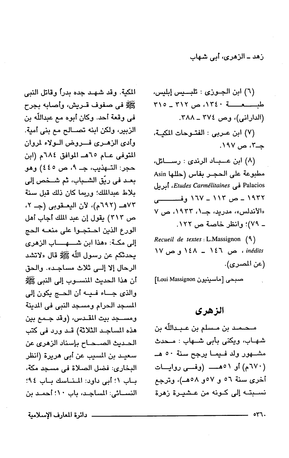 محمد بن مسلم بن عبد اللَّه بن شهاب، ويكنى يأبى شهاب: محدث مشهور ولد فيما يرجح سنة 50 هـ (670 م) أو 51 هـ (وفى روايات أخرى سنة 56 و 57 و 58 هـ)، وترجع نسبته إلى كونه من عشيرة زهرة المكية. وقد شهد جده بدرًا وقاتل النبى -صلى اللَّه عليه وسلم- فى صفوف قريش، وأصابه بجرح فى وقعة أحد. وكان أبوه مع عبد اللَّه بن الزبير، ولكن ابنه تصالح مع بنى أمية. وأدى الزهرى فروض الولاء لمروان المتوفى عام 65 هـ الموافق 684 م (ابن حجر: التهذيب، جـ 9، ص 445) وهو بعد فى ريّق الشباب، ثم شخص إلى بلاط عبد الملك؛ وربما كان ذلك قبل سنة 73 هـ (692 م)، لأن اليعقوبى (جـ 2، ص 313) يقول إن عبد الملك أجاب أهل الورع الذين احتجوا على منعه الحج إلى مكة: "هذا ابن شهاب الزهرى يحدثكم عن رسول اللَّه -صلى اللَّه عليه وسلم- قال "لا تشد الرحال إلا إلى ثلاث مساجد". والحق أن هذا الحديث المنسوب إلى النبى -صلى اللَّه عليه وسلم- والذى جاء فيه أن الحج يكون إلى المسجد الحرام ومسجد النبى فى المدينة ومسجد بيت المقدس، (وقد جمع بين هذه المساجد الثلاثة) قد ورد فى كتب الحديث الصحاح بإسناد الزهرى عن سعيد بن المسيب عن أبى هريرة (انظر البخارى: فضل الصلاة فى مسجد مكة، باب 1؛ أبى داود: المناسك باب 94؛ النسائى: المساجد، باب 10؛ أحمد بن