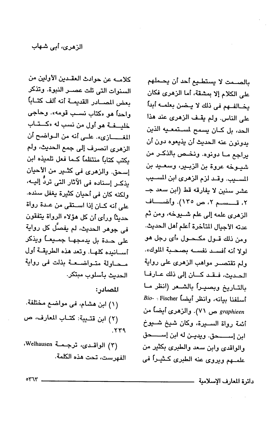 بالصمت لا يستطيع أحد أن يحملهم على الكلام إلا بمشقة، أما الزهرى فكان يخالفهم فى ذلك لا يضن بعلمه أبدًا على الناس. ولم يقف الزهرى عند هذا الحد، بل كان يسمح لمستمعيه الذين يدونون عنه الحديث أن يذيعوه دون أن يراجع ما دونوه. ونخص بالذكر من شيوخه عروة بن الزبير، وسعيد بن المسيب. وقد لزم الزهرى ابن المسيب عشر سنين لا يفارقه قط (ابن سعد جـ 2، قسم 2، ص 135). وأضاف الزهرى علمه إلى علم شيوخه، ومن ثم عدته الأجيال المتأخرة أعلم أهل الحديث. ومن ذلك قول مكحول "أى رجل هو لولا أنه أفسد ففسه بصحبة الملوك". ولم تقتصر مواهب الزهرى على رواية الحديث، فقد كان إلى ذلك عارفا بالتاريخ وبصيرًا بالشعر (انظر ما أسلفنا بيانه، وانظر أيضًا Bio-graphieen: Fischer ص 71). والزهرى أيضًا من أئمة رواة السيرة، وكان شيخ شيوخ ابن إسحق. ويدين له ابن إسحق والواقدى وابن سعد والطبرى بكثير من علمهم ويروى عنه الطبرى كثيرًا فى كلامه عن حوادث العقدين الأولين من السنوات التى تلت عصر النبوة. وتذكر بعض المصادر القديمة أنه ألف كتابًا واحدًا هو "كتاب نسب قومه". وحاجى خليفط هو أول من نسب له "كتاب المغازى". على أنه من الواضح أن الزهرى انصرف إلى جمع الحديث، ولم يكتب كتابًا منتظمًا كما فعل تلميذه ابن إسحق. والزهرى فى كثير من الأحيان يذكر إسناده فى الآثار التى تردُّ إليه، ولكنه كان فى أحيان كثيرة يغفل سنده. على أنه كان إذا استقى من عدة رواة حديثًا ورأى أن كل هؤلاء الرواة يتفقون فى جوهر الحديث، لم يفصَّل كل رواية على حدة بل يدمجها جميعًا ويذكر أسانيده كلها. وتعد هذه الطريقة أول محاولة متواضعة بذلت فى رواية الحديث بأسلوب مبتكر.