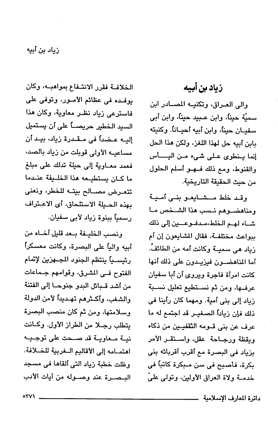 وقد خلط مشايعو بنى أمية ومناهضوهم نسب هذا الشخص ما شاء لهم الخلط، مدفوعين إلى ذلك ببواعث مختلفة، فقال المشايعون إن أم زياد هى سمية وكانت أمه من الطائف. أما المناهضون فيزيدون على ذلك أنها كانت امرأة فاجرة ويروى أن أبا سفيان عرفها، ومن ثم نستطيع تعليل نسبة زياد إلى بنى أمية. ومهما كان رأينا فى ذلك فإن زيادًا الصغير قد اجتمع له ما عرف عن بنى قومه الثقفيين من ذكاء ويقظة ورجاحة عقل، واستقر الأمر بزياد فى البصرة مع أقرب أقربائه بنى بكرة، فأصبح فى سن مبكرة كاتبًا فى خدمة ولاة العراق الأولين، وتولى علىّ الخلافة فقرر الانتفاع بمواهبه، وكان يوفده فى عظائم الأمور، وتوفى على فاسترعى زياد نظر معاوية، وكان هذا السيد الخطير حريصًا على أن يستميل إليه عضدًا فى مقدرة زياد، بيد أن مساعيه الأولى قوبلت من زياد بالصد، فعمد معاوية إلى حيلة تدلك على مبلغ ما كان يستطيعه هذا الخليفة عندما تتعرض مصالح بيته للخطر، ونعنى بهذه الحيلة الاستلحاق، أى الاعتراف رسميا ببنوة زياد لأبى سفيان.