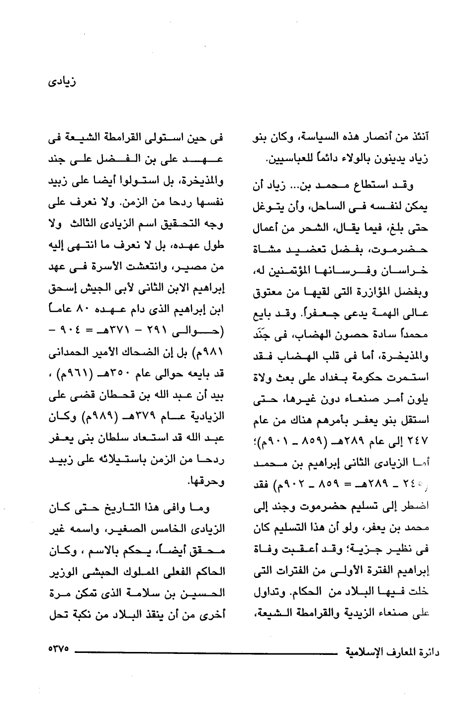 وقد استطاع محمد بن. . . زياد أن يمكن لنفسه فى الساحل، وأن يتوغل حتى بلغ، فيما يقال، الشحر من أعمال حضرموت، بفضل تعضيد مشاة خراسان وفرسانها المؤتمنين له، وبفضل المؤازرة التى لقيها من معتوق عالى الهمة يدعى جعفرًا. وقد بايع محمدًا سادة حصون الهضاب، فى جَنَد والمذيخرة، أما فى قلب الهضاب فقد استمرت حكومة بغداد على بعث ولاة يلون أمر صنعاء دون غيرها، حتى استقل بنو يعفر بأمرهم هناك من عام 247 إلى عام 289 هـ (859 - 901 م)؛ أما الزيادى الثانى إبراهيم بن محمد (245 - 289 هـ = 859 - 902 م) فقد اضطر إلى تسليم حضرموت وجند إلى محمد بن يعفر، ولو أن هذا التسليم كان فى نظير جزية؛ وقد أعقبت وفاة إبراهيم الفترة الأولى من الفترات التى خلت فيها البلاد من الحكام. وتداول حكلى صنعاء الزيدية والقرامطة الشيعة، فى حين استولى القرامطة الشيعة فى عهد على بن الفضل على جند والمذيخرة، بل استولوا أيضا على زبيد نفسها ردحا من الزمن. ولا نعرف على وجه التحقيق اسم الزيادى الثالث ولا طول عهده، بل لا نعرف ما انتهى إليه من مصير، وانتعشت الأسرة فى عهد إبراهيم الابن الثانى لأبى الجيش إسحق ابن إبراهيم الذى دام عهده 80 عامًا (حوالي 291 - 371 هـ = 904 - 981 م) بل إن الضحاك الأمير الحمدانى قد بايعه حوالى عام 350 هـ (961 م)، بيد أن عبد اللَّه بن قحطان قضى على الزيادية عام 379 هـ (989 م) وكان عبد اللَّه قد استعاد سلطان بنى يعفر ردحا من الزمن باستيلائه على زبيد وحرقها.