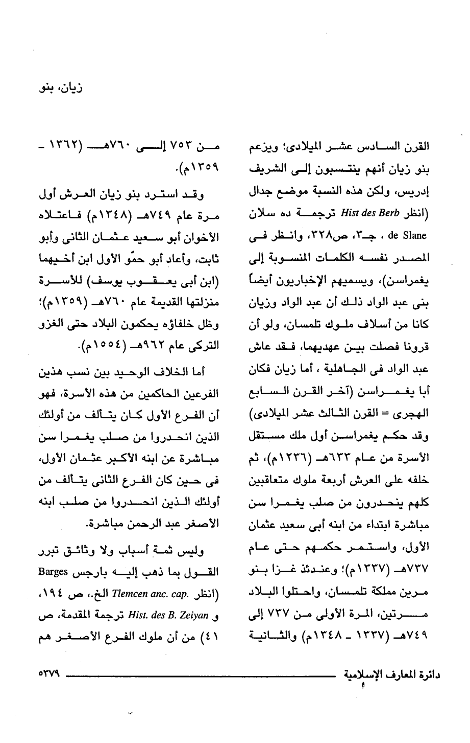القرن السادس عشر الميلادى؛ ويزعم بنو زيان أنهم ينتسبون إلى الشريف إدريس، ولكن هذه النسبة موضع جدال (انظر Hist des Berh ترجمة ده سلان de Slane . جـ 3، ص 328، وانظر فى المصدر نفسه الكلمات المنسوبة إلى يغمراسن)، ويسميهم الإخباريون أيضا بنى عبد الواد ذلك أن عبد الواد وزيان كانا من أسلاف ملوك تلمسان، ولو أن قرونا فصلت بين عهديهما، فقد عاش عبد الواد فى الجاهلية، أما زيان فكان أبا يغمراسن (آخر القرن السابع الهجرى = القرن الثالث عشر الميلادى) وقد حكم يغمراسن أول ملك مستقل الأسرة من عام 633 هـ (1236 م)، ثم خلفه على العرش أربعة ملوك متعاقبين كلهم ينحدرون من صلب يغمرا سن مباشرة ابتداء من ابنه أبى سعيد عثمان الأول، واستمر حكمهم حتى عام 737 هـ (1337 م)؛ وعندئذ غزا بنو مرين مملكة تلمسان، واحتلوا البلاد مرتين، المرة الأولى من 737 إلى 749 هـ (1337 - 1348 م) والثانية من 753 إلى 760 هـ (1362 - 1359 م).