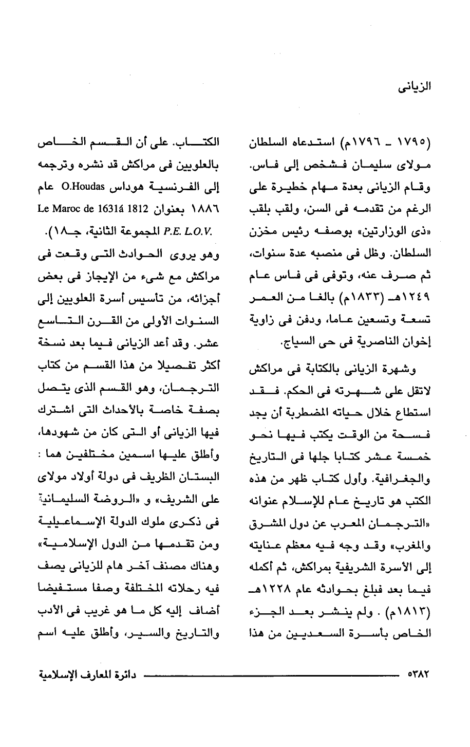 (1795 - 1796 م) استدعاه السلطان مولاى سليمان فشخص إلى فاس. وقام الزيانى بعدة مهام خطيرة على الرغم من تقدمه فى السن، ولقب بلقب "ذى الوزارتين" بوصفه رئيس مخزن السلطان. وظل فى منصبه عدة سنوات، ثم صرف عنه، وتوفى فى فاس عام 1249 هـ (1833 م) بالغا من العمر تسعة وتسعين عاما، ودفن فى زاوية إخوان الناصرية فى حى السياج.