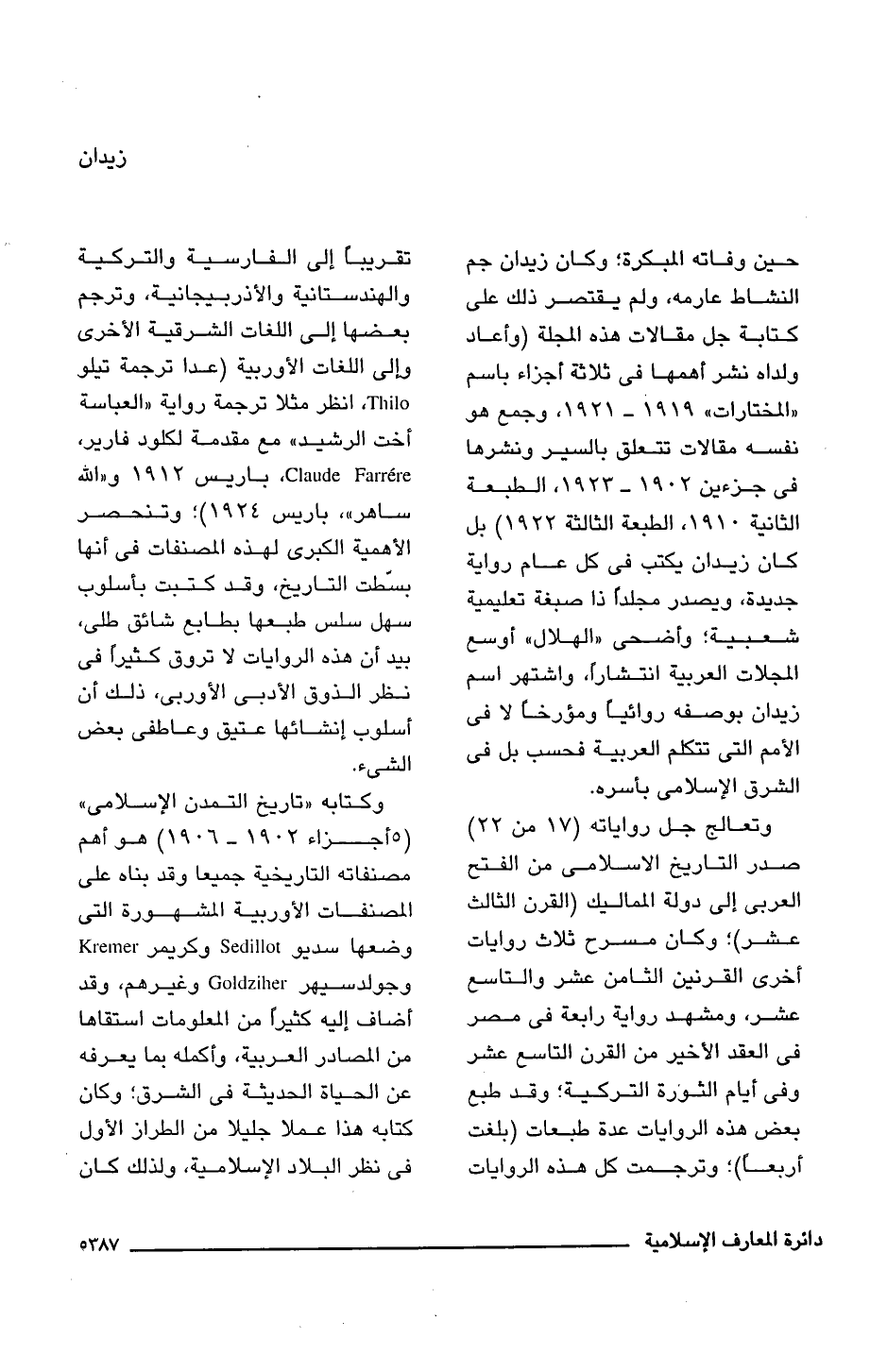 حين وفاته المبكرة؛ وكان زيدان جم النشاط عارمه، ولم يقتصر ذلك على كتابة جل مقالات هذه المجلة (وأعاد ولداه نشر أهمها فى ثلاثة أجزاء باسم "المختارات" 1919 - 1921، وجمع هو نفسه مقالات تتعلق بالسير ونشرها فى جزءين 1902 - 1923، الطبعة الثانية 1910 الطبعة الثالثة 1922) بل كان زيدان يكتب فى كل عام رواية جديدة، ويصدر مجلدًا ذا صبغة تعليمية شعبية؛ وأضحى "الهلال" أوسع المجلات العربية انتشارًا، واشتهر اسم زيدان بوصفه روائيًا ومؤرخًا لا فى الأمم التى تتكلم العربية فحسب بل فى الشرق الإسلامى بأسره.