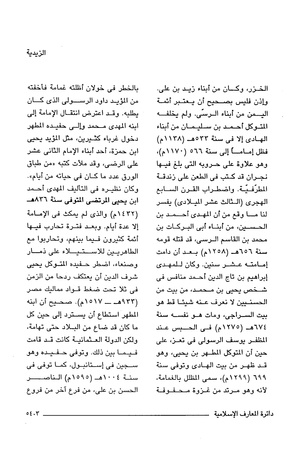 الخزر، وكان من أبناء زيد بن على. وإذن فليس بصحيح أن يعتبر أئمة اليمن من أبناء الرسّى. ولم يخلفه المتوكل أحمد بن سليمان من أبناء الهادى إلا فى سنة 533 هـ (1138 م) فظل إمامًا إلى سنة 566 (1170 م)، وهو علاوة على حروبه التى بلغ فيها نجران قد كتب فى الطعن على زندقة المطرّفيّة. واضطراب القرن السابع الهجرى (الثالث عشر الميلادى) يفسر لنا ما وقع من أن المهدى أحمد بن الحسين، من أبناء أبى البركات بن محمد بن القاسم الرسى، قد قتله قومه سنة 656 هـ (1258 م) بعد أن دامت إمامته عشر سنين. وكان للمهدى إبراهيم بن تاج الدين أحمد منافس فى شخص يحيى بن محمد، من بيت من الحسنيين لا نعرف عنه شيئًا قط هو بيت السراجى، ومات هو نفسه سنة 674 هـ (1275 م) فى الحبس عند المظفر يوسف الرسولى فى تعز، على حين أن المتوكل المطهر بن يحيى، وهو قد ظهر من بيت الهادى وتوفى سنة 699 (1299 م)، سمى المظلل بالغمامة، لأنه وهو مرتد من غزوة محفوفة بالخطر فى خولان أظلته غمامة فأخفته من المؤيد داود الرسولى الذى كان يطلبه. وقد اعترض انتقال الإمامة إلى ابنه المهدى محمد وإلى حفيده المطهر دخول غرباء كثيرين، مثل المؤيد يحيى ابن حمزة، أحد أبناء الإمام الثانى عشر على الرضى، وقد ملأت كتبه "من طباق الورق عدد ما كان فى حياته من أيام". وكان نظيره فى التأليف المهدى أحمد ابن يحيى المرتضى المتوفى سنة 836 هـ (1432 م) والذى لم يمكث فى الإمامة إلا عدة أيام. وبعد فترة تحارب فيها أئمة كثيرون فيما بينهم، وتحاربوا مع الطاهريين للاستيلاء على ذمار وصنعاء، اضطر حفيده المتوكل يحيى شرف الدين أن يعتكف ردحا من الزمن فى ثلا تحت ضغط قواد مماليك مصر (933 هـ - 1517 م). صحيح أن ابنه المطهر استطاع أن يسترد إلى حين كل ما كان قد ضاع من البلاد حتى تهامة، ولكن الدولة العثمانية كانت قد قامت فيما بين ذلك. وتوفى حفيده وهو سجين فى إستانبول، كما توفى فى سنة 1004 هـ (1595 م) الناصر الحسن بن على، من فرع آخر من فروع