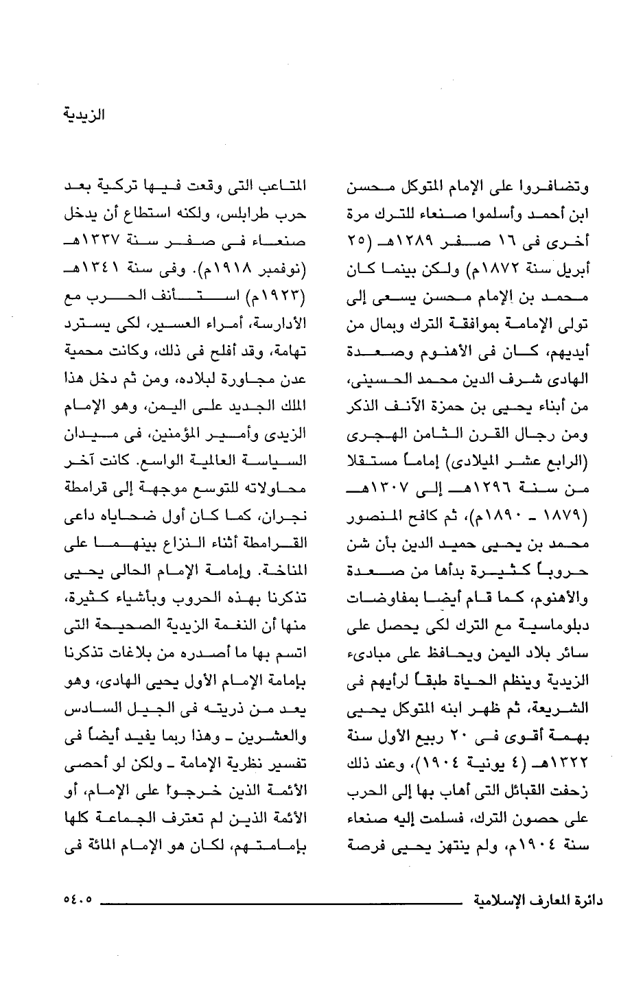 وتضافروا على الإمام المتوكل محسن ابن أحمد وأسلموا صنعاء للترك مرة أخرى فى 16 صفر 1289 هـ (25 أبريل سنة 1872 م) ولكن بينما كان محمد بن الإمام محسن يسعى إلى تولى الإمامة بموافقة الترك وبمال من أيديهم، كان فى الأهنوم وصعدة الهادى شرف الدين محمد الحسينى، من أبناء يحيى بن حمزة الآنف الذكر ومن رجال القرن الثامن الهجرى (الرابع عشر الميلادى) إمامًا مستقلا من سنة 1296 هـ إلى 1307 هـ (1879 - 1890 م)، ثم كافح المنصور محمد بن يحيى حميد الدين بأن شن حروبًا كثيرة بدأها من صعدة والأهنوم، كما قام أيضا بمفاوضات دبلوماسية مع الترك لكى يحصل على سائر بلاد اليمن ويحافظ على مبادئ الزيدية وينظم الحياة طبقًا لرأيهم فى الشريعة، ثم ظهر ابنه المتوكل يحيى بهمة أقوى فى 20 ربيع الأول سنة 1322 هـ (4 يونية 1904)، وعند ذلك زحفت القبائل التى أهاب بها إلى الحرب على حصون الترك، فسلمت إليه صنعاء سنة 1904 م، ولم ينتهز يحيى فرصة المتاعب التى وقعت فيها تركية بعد حرب طرابلس، ولكنه استطاع أن يدخل صنعاء فى صفر سنة 1337 هـ (نوفمبر 1918 م). وفى سنة 1341 هـ (1923 م) استأنف الحرب مع الأدارسة، أمراء العسير، لكى يسترد تهامة، وقد أفلح فى ذلك، وكانت محمية عدن مجاورة لبلاده، ومن ثم دخل هذا الملك الجديد على اليمن، وهو الإمام الزيدى وأمير المؤمنين، فى ميدان السياسة العالمية الواسع. كانت آخر محاولاته للتوسع موجهة إلى قرامطة نجران، كما كان أول ضحاياه داعى القرامطة أثناء النزاع بينهما على المناخة. وإمامة الإمام الحالى يحيى تذكرنا بهذه الحروب وبأشياء كثيرة، منها أن النغمة الزيدية الصحيحة التى اتسم بها ما أصدره من بلاغات تذكرنا بإمامة الإمام الأول يحيى الهادى، وهو يعد من ذريته فى الجيل السادس والعشرين -وهذا ربما يفيد أيضًا فى تفسير نظرية الإمامة- ولكن لو أحصى الأئمة الذين خرجوا على الإمام، أو الأئمة الذين لم تعترف الجماعة كلها بإمامتهم، لكان هو الإمام المائة فى