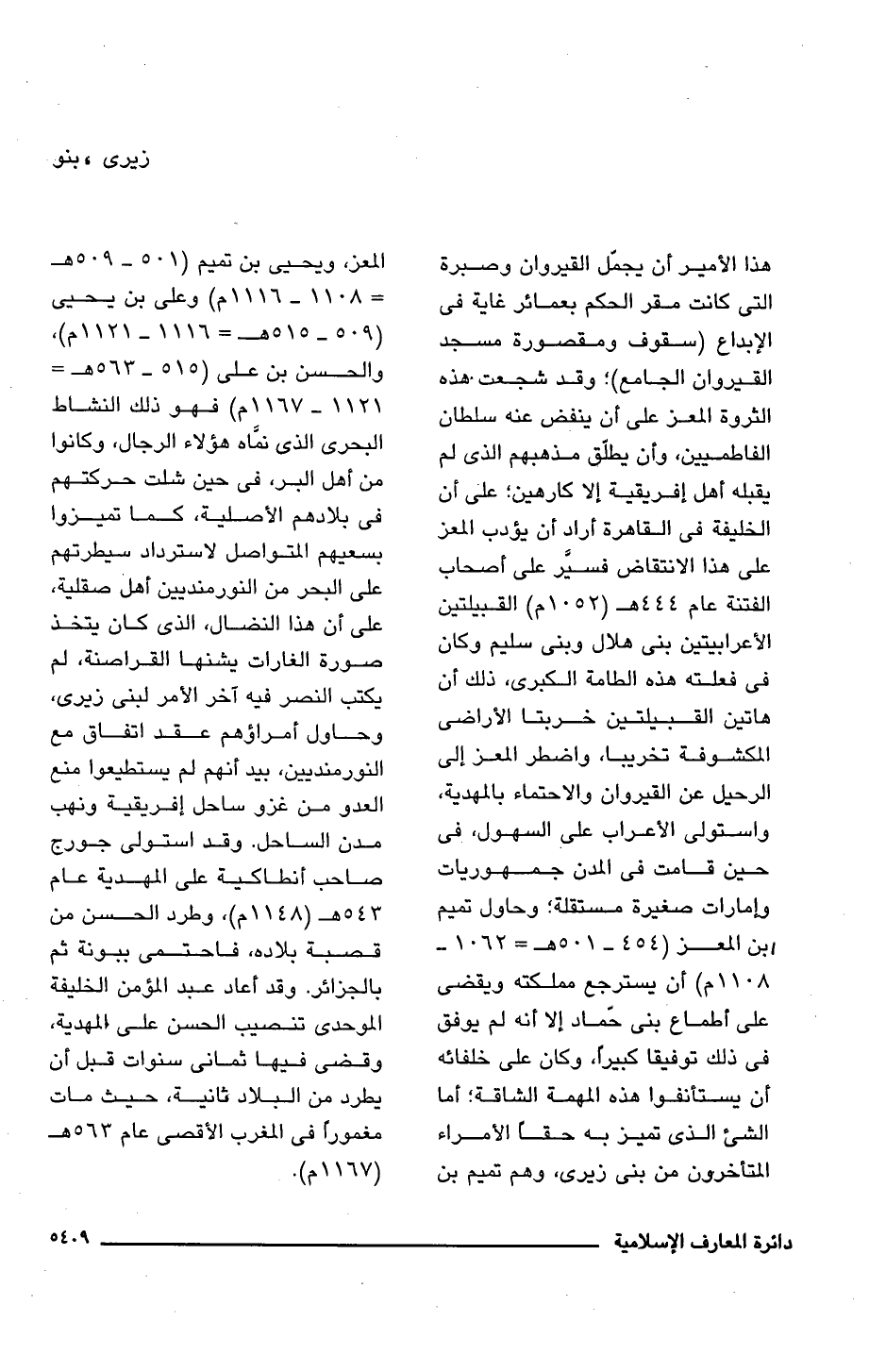 هذا الأمير أن يجمّل القيروان وصبرة التى كانت مقر الحكم بعمائر غاية فى الإبداع (سقوف ومقصورة مسجد القيروان الجامع)؛ وقد شجعت. هذه الثروة المعز على أن ينفض عنه سلطان الفاطميين، وأن يطلّق مذهبهم الذى لم يقبله أهل إفريقية إلا كارهين؛ على أن الخليفة فى القاهرة أراد أن يؤدب المعز على هذا الانتقاض فسيِّر على أصحاب الفتنة عام 444 هـ (1052 م) القبيلتين الأعرابيتين بنى هلال وبنى سليم وكان فى فعلته هذه الطامة الكبرى، ذلك أن هاتين القبيلتين خربتا الأراضى المكشوفة تخريبا، واضطر المعز إلى الرحيل عن القيروان والاحتماء بالمهدية، واستولى الأعراب على السهول، فى حين قامت فى المدن جمهوريات وإمارات صغيرة مستقلة؛ وحاول تميم ابن المعز (454 - 501 هـ = 1062 - 1108 م) أن يسترجع مملكته ويقضى على أطماع بنى حماد إلا أنه لم يوفق فى ذلك توفيقا كبيرًا، وكان على خلفائه أن يستأنفوا هذه المهمة الشاقة؛ أما الشئ الذى تميز به حقًا الأمراء المتأخرون من بنى زيرى، وهم تميم بن المعز، ويحيى بن تميم (501 - 509 هـ = 1108 - 1116 م) وعلى بن يحيى (509 - 515 هـ = 1116 - 1121 م)، والحسن بن على (515 - 563 هـ = 1121 - 1167 م) فهو ذلك النشاط البحرى الذى نمَّاه هؤلاء الرجال، وكانوا من أهل البر، فى حين شلت حركتهم فى بلادهم الأصلية، كما تميزوا بسعيهم المتواصل لاسترداد سيطرتهم على البحر من النورمنديين أهل صقلية، على أن هذا النضال، الذى كان يتخذ صورة الغارات يشنها القراصنة، لم يكتب النصر فيه آخر الأمر لبنى زيرى، وحاول أمراؤهم عقد اتفاق مع النورمنديين، بيد أنهم لم يستطيعوا منع العدو من غزو ساحل إفريقية ونهب مدن الساحل. وقد استولى جورج صاحب أنطاكية على المهدية عام 543 هـ (1148 م)، وطرد الحسن من قصبة بلاده، فاحتمى ببونة ثم بالجزائر. وقد أعاد عبد المؤمن الخليفة الموحدى تنصيب الحسن على المهدية، وقضى فيها ثمانى سنوات قبل أن يطرد من البلاد ثانية، حيث مات مغمورًا فى المغرب الأقصى عام 563 هـ (1167 م).