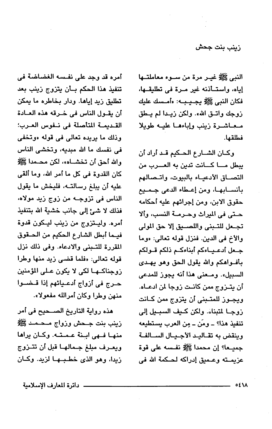 هذه رواية التاريخ الصحيح فى أمر زينب بنت جحش وزواج محمد -صلى اللَّه عليه وسلم- منها فهى ابنة عمته. وكان يراها ويعرف مبلغ جمالها قبل أن تتزوج زيدا، وهو الذى خطبها لزيد. وكان