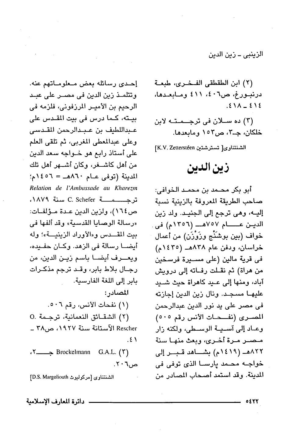 أبو بكر محمد بن محمد الخوافى: صاحب الطريقة المعروفة بالزينية نسبة إليه، وهى ترجع إلى الجنيد. ولد زين الدين عام 757 هـ (1356 م) فى خواف (بين بوشَنْج وزَوْزَن) من أعمال خراسان، ودفن عام 838 هـ (1435 م) فى قرية مالين (على مسيرة فرسخين من هراة) ثم نقلت رفاته إلى درويش آباد، ومنها إلى عيد كاهراة حيث شيد عليها مسجد. ونال زين الدين إجازته فى مصر على يد نور الدين عبد الرحمن المصرى (نفحات الإنس رقم 505) وعاد إلى آسية الوسطى، ولكنه زار مصر مرة أخرى، وبعث منها سنة 822 هـ (1419 م) بشاهد قبر إلى خواجه محمد بارسا الذى توفى فى المدينة. وقد استمد أصحاب المصادر من إحدى رسائله بعض معلوماتهم عنه. وتتلمذ زين الدين فى مصر على عبد الرحيم بن الأمير المرزفونى، فلزمه فى بيته، كما درس فى بيت المقدس على عبد اللطيف بن عبد الرحمن المقدسى وعلى عبد المعطى المغربى، ثم تلقى العلم على أستاذ رابع هو خواجه سعد الدين من أهل كاشغر، وكان أشهر أهل تلك المدينة (توفى عام 860 هـ = 1456 م؛ Relation de l'Ambassade au Kharezm ترجمة C. Schefer سنة 1879، ص 164) , ولزين الدين عدة مؤلفات: "رسالة الوصايا القدسية" وقد ألفها فى بيت المقدس و"الأوراد الزينية"؛ وله أيضا رسالة فى الزهد. وكان حفيده، ويعرف أيضا باسم زين الدين، من رجال بلاط بابر، وقد ترجم مذكرات بابر إلى اللغة الفارسية.