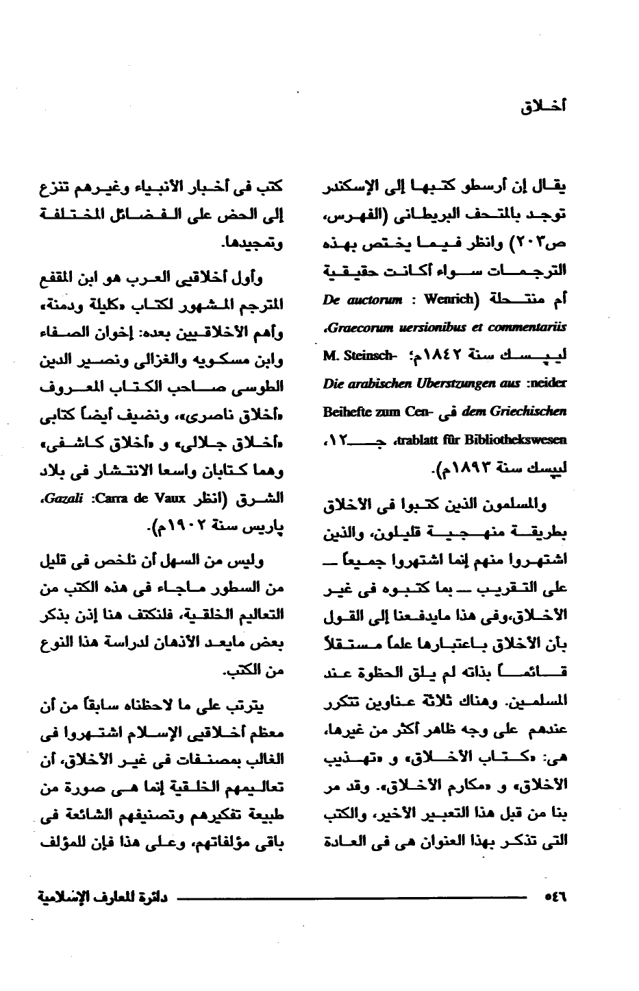 وأول أخلاقيى العرب هو ابن المقفع المترجم المشهور لكتاب "كليلة ودمنة" وأهم الأخلاقيين بعده: إخوان الصفاء وابن مسكويه والغزالى ونصير الدين الطوسى صاحب الكتاب المعروف "أخلاق ناصرى"، ونضيف أيضًا كتابى "أخلاق جلالى" و"أخلاق كاشفى" وهما كتابان واسعا الانتشار فى بلاد الشرق (انظر باريس سنة 1902 م).