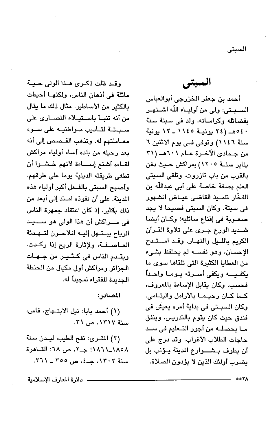 أحمد بن جعفر الخزرجى أبو العباس السبتى: ولى من أولياء اللَّه اشتهر بفضائله وكراماته، ولد فى سبتة سنة 540 هـ (24 يونية 1145 - 12 يونية سنة 1146) وتوفى فى يوم الاثنين 6 من جمادى الآخرة 601 هـ (31 يناير سنة 1205) بمراكش حيث دفن بالقرب من باب تازروت. وتلقى السبتى العلم بصفة خاصة على أبى عبد اللَّه بن الفخار تلميذ القاضى عياض المشهور فى سبتة. وكان السبتى فصيحا لا يجد صعوبة فى إقناع سائليه؛ وكان أيضا شديد الورع جرى على تلاوة القرآن الكريم بالليل والنهار. وقد امتدح الإحسان، وهو نفسه لم يحتفظ بشئ من العطايا الكثيرة التى تلقاها سوى ما يكفيه ويكفى أسرته يوما واحدًا فحسب. وكان يقابل الإساءة بالمعروف، كما كان رحيما بالأرامل واليتامى. وكان السبتى فى بداية أمره يعيش فى فندق حيث كان يقوم بالتدريس، وينفق ما يحصله من أجور التعليم فى سد حاجات الطلاب الأغراب. وقد درج على أن يطوف بشوارع المدينة يؤنب بل يضرب أولئك الذين لا يؤدون الصلاة.