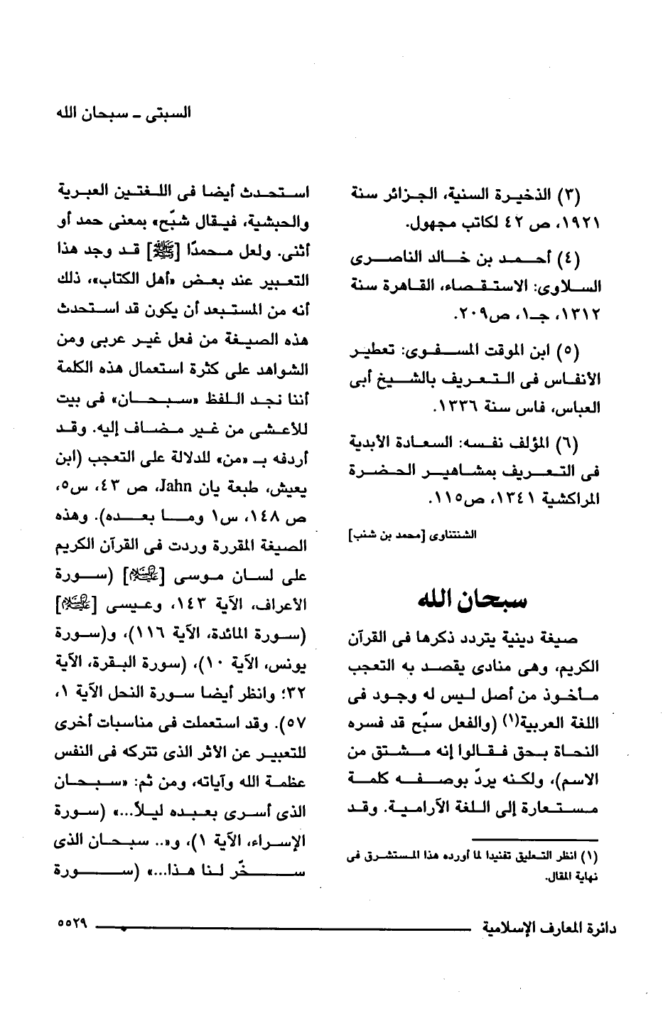 صيغة دينية يتردد ذكرها فى القرآن الكريم، وهى منادى يقصد به التعجب مأخوذ من أصل ليس له وجود فى اللغة العربية (¬1) (والفعل سبّح قد فسره النحاة بحق فقالوا أنه مشتق من الاسم)، ولكنه يردّ بوصفه كلمة مستعارة إلى اللغة الآرامية. وقد استحدث أيضًا فى اللغتين العبرية والحبشية، فيقال شبّح" بمعنى حمد أو أثنى. ولعل محمدًا [-صلى اللَّه عليه وسلم-] قد وجد هذا التعبير عند بعض "أهل الكتاب"، ذلك أنه من المستبعد أن يكون قد استحدث هذه الصيغة من فعل غير عربى ومن الشواهد على كثرة استعمال هذه الكلمة أننا نجد اللفظ "سبحان" فى بيت للأعشى من غير مضاف إليه. وقد أردفه بـ "من" للدلالة على التعجب (ابن يعيش، طبعة يان Jahn، ص 43، س 5، ص 148, س 1 وما بعده). وهذه الصيغة المقررة وردت فى القرآن الكريم على لسان موسى [عليه السلام] (سورة الأعراف، الآية 143، وعيسى [عليه السلام] (سورة المائدة، الآية 116)، (سورة يونس، الآية 10)، (سورة البقرة، الآية 32؛ وانظر أيضًا سورة النحل الآية 1، 57). وقد استعملت فى مناسبات أخرى للتعبير عن الأثر الذى تتركه فى النفس عظمة اللَّه وآياته، ومن ثم: {سُبْحَانَ الَّذِي أَسْرَى بِعَبْدِهِ لَيْلًا. . .} سورة الإسراء، الآية 1)، و {. . . سُبْحَانَ الَّذِي سَخَّرَ لَنَا هَذَا. . .} (سورة
