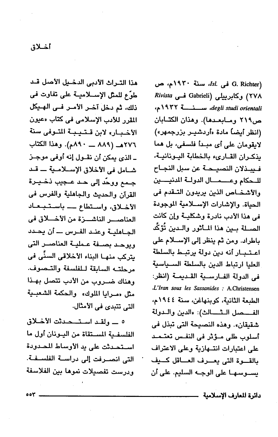 (G. Richter فى sl، سنة 1930 م، ص 278) وكابرييلى (Gabriel فى Rivista؛ al فى 4 studi orient، سنة 1932 م، ص 219 وما بعدها). وهذان الكتابان (انظر أيضا مادة "اردشير بزرجمهر") لا يقومان على أى مبدأ فلسفى، بل هما يذكران القارئ بالخطابة اليونانية، فيبذلان النصيحة عن سبل النجاح للحكام وعمال الدولة المدنيين والأشخاص الذين يريدون التقدم فى الحياة. والإشارات الإسلامية الموجودة فى هذا الأدب نادرة وشكلية وإن كانت الصلة بين هذا المأثور والدين تُؤكِّد باطراد. ومن ثم ينظر إلى الإسلام على اعتبار أنه دين دولة يرتبط بالسلطة العليا ارتباط الدين بالسلطة السياسية فى الدولة الفارسية القديمة (انظر: les Sassanides: A.Christensen L'Iran s 5. الطبعة الثانية، كوبنهاغن، سنة 1944 م، الفصل الثالث): "الدين والدولة شقيقان". وهذه النصيحة التى تبذل فى أسلوب طلى مؤثر فى النفس تعتمد على اعتبارات انتهازية وعلى الاعتراف بالقوة التى يعرف العاقل كيف يسوسها على الوجه السليم. على أن هذا التراث الأدبى الدخيل الأصل قد طوّع للمثل الإسلامية على تفاوت فى ذلك، ثم دخل آخر الأمر فى الهيكل المقرر للأدب الإسلامى فى كتاب "عيون الأخبار" لابن قتيبة المتوفى سنة 276 هـ (889 - 890 م). وهذا الكتاب - الذى يمكن أن نقول إنه أوفى موجز شامل فى الأخلاق الإسلامية- قد جمع ووحَد إلى حد عجيب ذخيرة القرآن والحديث والجاهلية والفرس فى الأخلاق، واستطاع -باستبعاد العناصر الناشزة من الأخلاق فى الجاهلية وعند الفرس- أن يحدد ويوحد بصفة عملية العناصر التى يتركب منها البناء الأخلاقى السنَّى فى مرحلته السابقة للفلسفة والتصوف. وهناك ضروب من الأدب تتصل بهذا مثل "مرايا الملوك" والحكمة الشعبية التى تتبدى فى الأمثال.