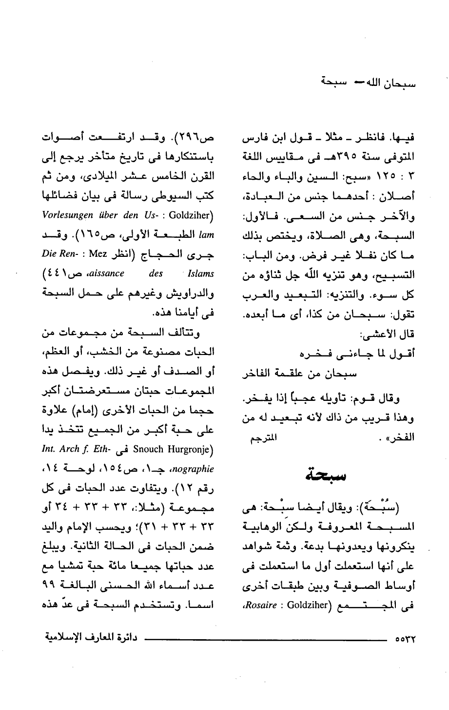 (سُبْحَة): ويقال أيضًا سبْحة: هى المسبحة المعروفة ولكن الوهابية ينكرونها ويعدونها بدعة. وثمة شواهد على أنها استعملت أول ما استعملت فى أوساط الصوفية وبين طبقات أخرى فى المجتمع (Rosaire: Goldziher, ص 296). وقد ارتفعت أصوات باستنكارها فى تاريخ متأخر يرجع إلى القرن الخامس عشر الميلادى، ومن ثم كتب السيوطى رسالة فى بيان فضائلها (Vorlesungen uber den Uslam: Goldziher الطبعة الأولى، ص 165). وقد جرى الحجاج (انظر Die Renaissance des Islams: Mez ص 441) والدراويش وغيرهم على حمل السبحة فى أيامنا هذه.