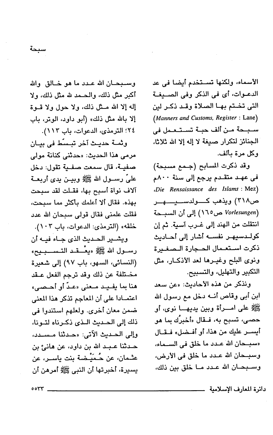 الأسماء، ولكنها تستخدم أيضا فى عد الدعوات، أى فى الذكر وفى الصيغة التى تختم بها الصلاة وقد ذكر لين (Manners and Customs, Register: Lane) سبحة من ألف حبة تستعمل فى الجنائز لتكرار صيغة لا إله إلا اللَّه ثلاثا، وكل مرة بألف.