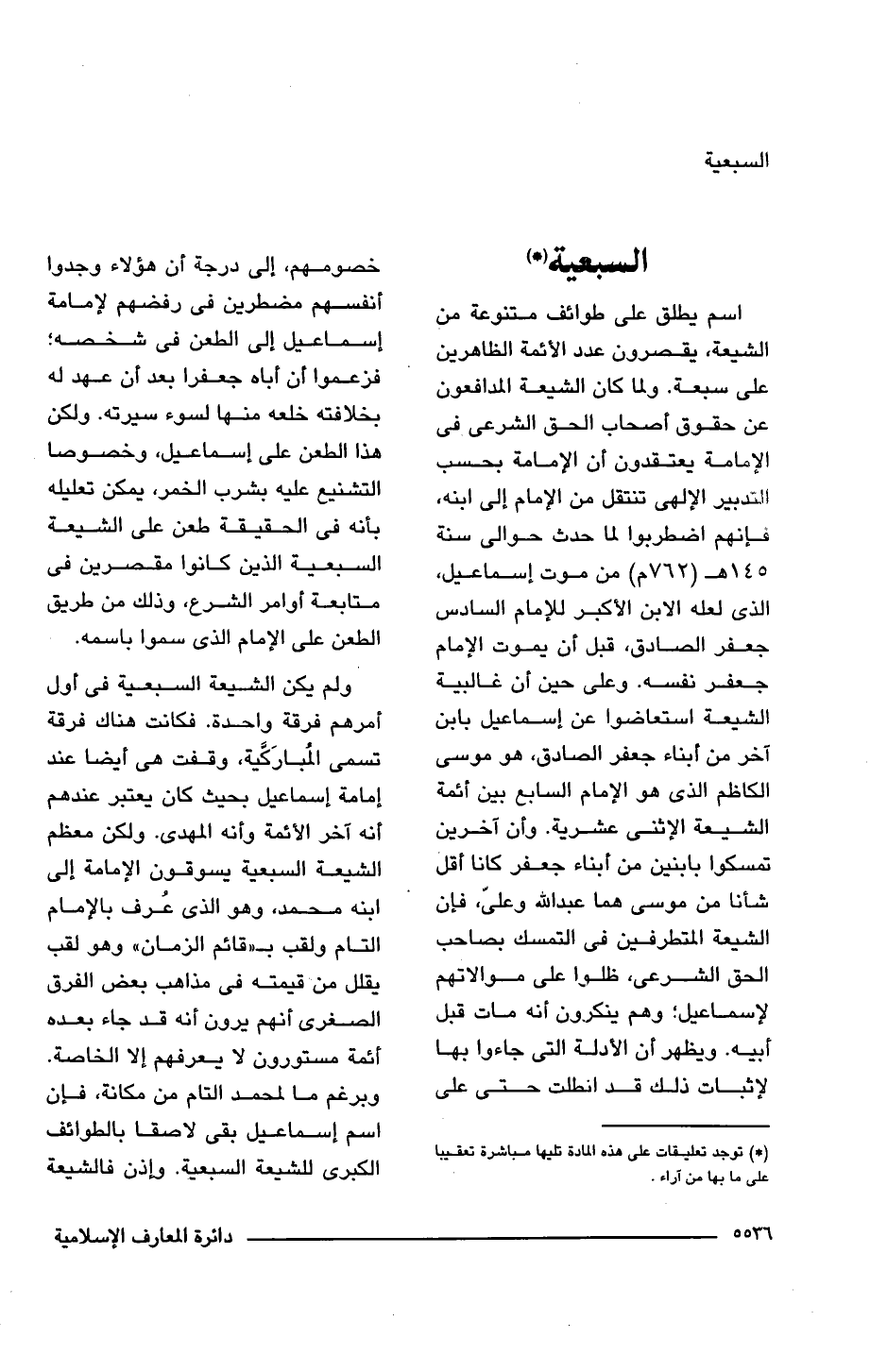 اسم يطلق على طوائف متنوعة من الشيعة، يقصرون عدد الأئمة الظاهرين على سبعة. ولما كان الشيعة المدافعون عن حقوق أصحاب الحق الشرعى فى الإمامة يعتقدون أن الإمامة بحسب التدبير الإلهى تنتقل من الإمام إلى ابنه، فإنهم اضطربوا لما حدث حوالى سنة 145 هـ (762 م) من موت إسماعيل، الذى لعله الابن الأكبر للإمام السادس جعفر الصادق، قبل أن يموت الإمام جعفر نفسه. وعلى حين أن غالبية الشيعة استعاضوا عن إسماعيل بابن آخر من أبناء جعفر الصادق، هو موسى الكاظم الذى هو الإمام السابع بين أئمة الشيعة الإثنى عشرية. وأن آخرين تمسكوا بابنين من أبناء جعفر كانا أقل شأنا من موسى هما عبد اللَّه وعلىّ، فإن الشيعة المتطرفين فى التمسك بصاحب الحق الشرعى، ظلوا على موالاتهم لإسماعيل؛ وهم ينكرون أنه مات قبل أبيه. ويظهر أن الأدلة التى جاءوا بها لإثبات ذلك قد انطلت حتى على خصومهم، إلى درجة أن هؤلاء وجدوا أنفسهم مضطرين فى رفضهم لإمامة إسماعيل إلى الطعن فى شخصه؛ فزعموا أن أباه جعفرا بعد أن عهد له بخلافته خلعه منها لسوء سيرته. ولكن هذا الطعن على إسماعيل، وخصوصا التشنيع عليه بشرب الخمر، يمكن تعليله بأنه فى الحقيقة طعن على الشيعة السبعية الذين كانوا مقصرين فى متابعة أوامر الشرع، وذلك من طريق الطعن على الإمام الذى سموا باسمه.