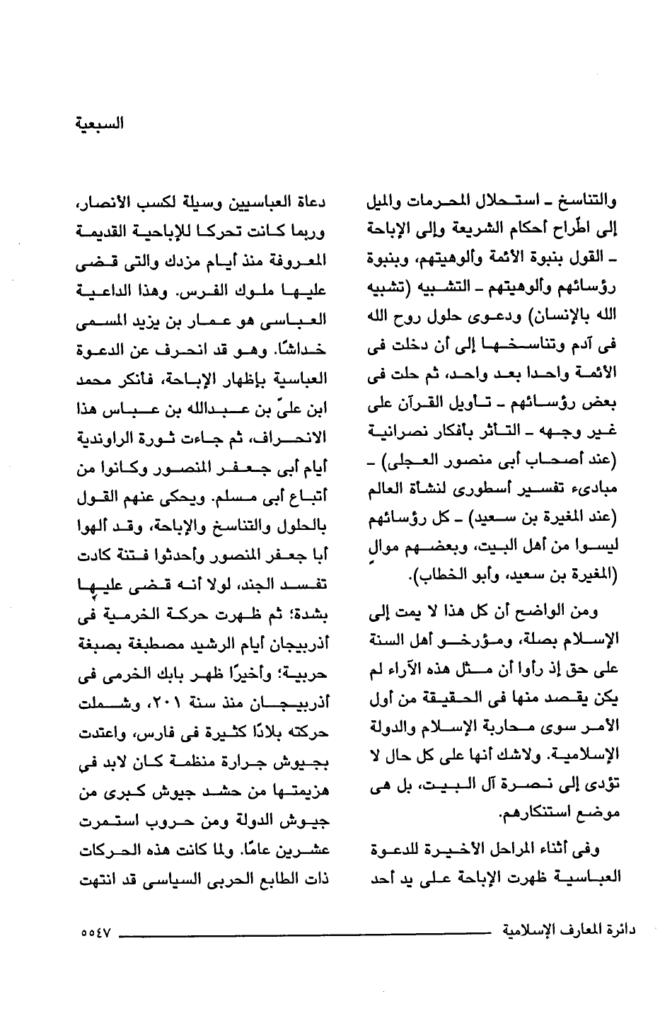 وفى أثناء المراحل الأخيرة للدعوة العباسية ظهرت الإباحة على يد أحد دعاة العباسيين وسيلة لكسب الأنصار، وربما كانت تحركا للإباحية القديمة المعروفة منذ أيام مزدك والتى قضى عليها ملوك الفرس. وهذا الداعية العباسى هو عمار بن يزيد المسمى خداشًا. وهو قد انحرف عن الدعوة العباسية بإظهار الإباحة، فأنكر محمد ابن على بن عبد اللَّه بن عباس هذا الانحراف، ثم جاءت ثورة الراوندية أيام أبى جعفر المنصور وكانوا من أتباع أبى مسلم. ويحكى عنهم القول بالحلول والتناسخ والإباحة، وقد ألهوا أبا جعفر المنصور وأحدثوا فتنة كادت تفسد الجند، لولا أنه قضى عليها بشدة؛ ثم ظهرت حركة الخرمية فى أذربيجان أيام الرشيد مصطبغة بصبغة حربية؛ وأخيرًا ظهر بابك الخرمى فى أذربيجان منذ سنة 201، وشملت حركته بلادًا كثيرة فى فارس، واعتدت بجيوش جرارة منظمة كان لابد فى هزيمتها من حشد جيوش كبرى من جيوش الدولة ومن حروب استمرت عشرين عامًا. ولما كانت هذه الحركات ذات الطابع الحربى السياسى قد انتهت