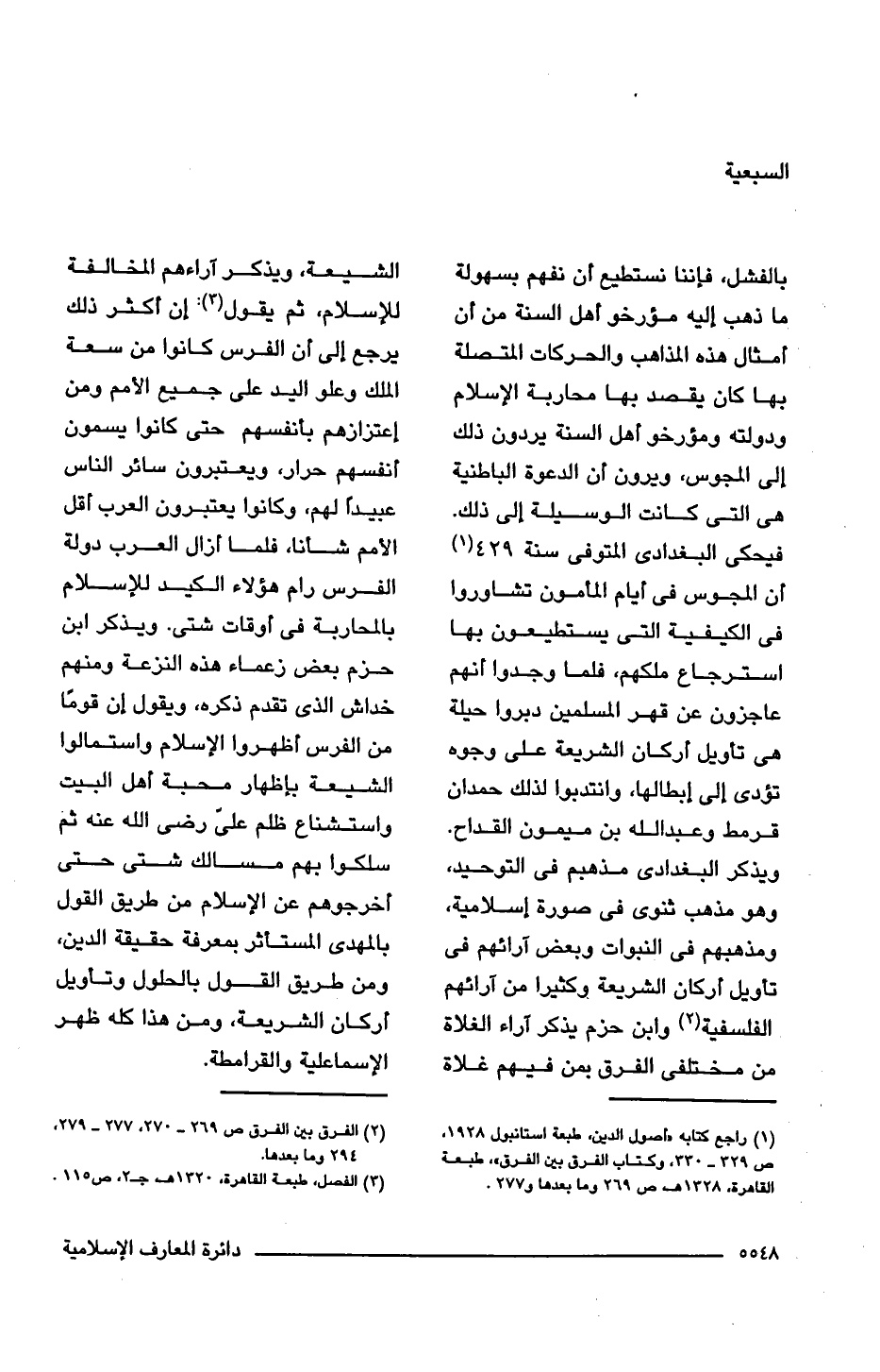 بالفشل، فإننا نستطيع أن نفهم بسهولة ما ذهب اليه مؤرخو أهل السنة من أن أمثال هذه المذاهب والحركات المتصلة بها كان يقصد بها محاربة الإسلام ودولته ومؤرخو أهل السنة يردون ذلك إلى المجوس، ويرون أن الدعوة الباطنية هى التى كانت الوسيلة إلى ذلك. فيحكى البغدادى المتوفى سنة 429 (¬1) أن المجوس فى أيام المأمون تشاوروا فى الكيفية التى يستطيعون بها استرجاع ملكهم، فلما وجدوا أنهم عاجزون عن قهر المسلمين دبروا حيلة هى تأويل أركان الشريعة على وجوه تؤدى إلى إبطالها، وانتدبوا لذلك حمدان قرمط وعبد اللَّه بن ميمون القداح. ويذكر البغدادى مذهبهم فى التوحيد، وهو مذهب ثنوى فى صورة إسلامية، ومذهبهم فى النبوات وبعض آرائهم فى تأويل أركان الشريعة وكثيرا من آرائهم الفلسفية (¬2) وابن حزم يذكر آراء الغلاة من مختلفى الفرق بمن فيهم غلاة الشيعة، ويذكر آراءهم المخالفة للإسلام، ثم يقول (¬3): أن أكثر ذلك يرجع إلى أن الفرس كانوا من سعة الملك وعلو اليد على جميع الأمم ومن إعتزازهم بأنفسهم حتى كانوا يسمون أنفسهم حرار، ويعتبرون سائر الناس عبيدًا لهم، وكانوا يعتبرون العرب أقل الأمم شأنا، فلما أزال العرب دولة الفرس رام هؤلاء الكيد للإسلام بالمحاربة فى أوقات شتى. ويذكر ابن حزم بعض زعماء هذه النزعة ومنهم خداش الذى تقدم ذكره، ويقول إن قومًا من الفرس أظهروا الإسلام واستمالوا الشيعة بإظهار محبة أهل البيت واستشناع ظلم علىّ رضى اللَّه عنه ثم سلكوا بهم مسالك شتى حتى أخرجوهم عن الإسلام من طريق القول بالمهدى المستأثر بمعرفة حقيقة الدين، ومن طريق القول بالحلول وتأويل أركان الشريعة، ومن هذا له ظهر الإسماعلية والقرامطة.