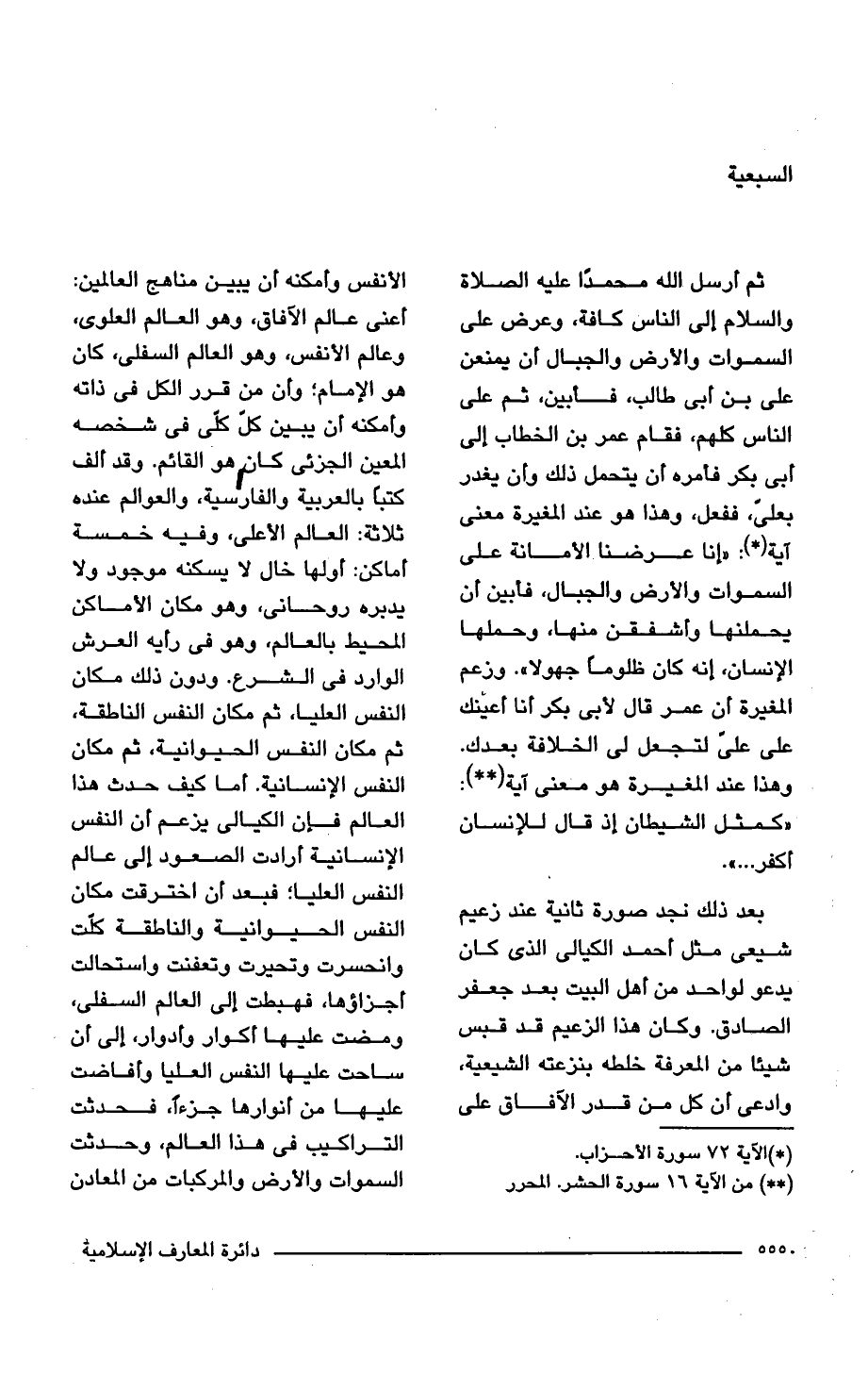ثم أرسل اللَّه محمدًا عليه الصلاة والسلام إلى الناس كافة، وعرض على السموات والأرض والجبال أن يمنعن على بن أبى طالب، فأبين، ثم على الناس كلهم، فقام عمر بن الخطاب إلى أبى بكر فأمره أن يتحمل ذلك وأن يغدر بعلىّ، ففعل، وهذا هو عند المغيرة معنى آية (*): {إِنَّا عَرَضْنَا الْأَمَانَةَ عَلَى السَّمَاوَاتِ وَالْأَرْضِ وَالْجِبَالِ فَأَبَيْنَ أَنْ يَحْمِلْنَهَا وَأَشْفَقْنَ مِنْهَا وَحَمَلَهَا الْإِنْسَانُ إِنَّهُ كَانَ ظَلُومًا جَهُولًا}. وزعم المغيرة أن عمر قال لأبى بكر أنا أعينك على علىّ لتجعل لى الخلافة بعدك. وهذا عند المغيرة هو معنى آية (* *): {كَمَثَلِ الشَّيْطَانِ إِذْ قَالَ لِلْإِنْسَانِ اكْفُرْ. . .}.