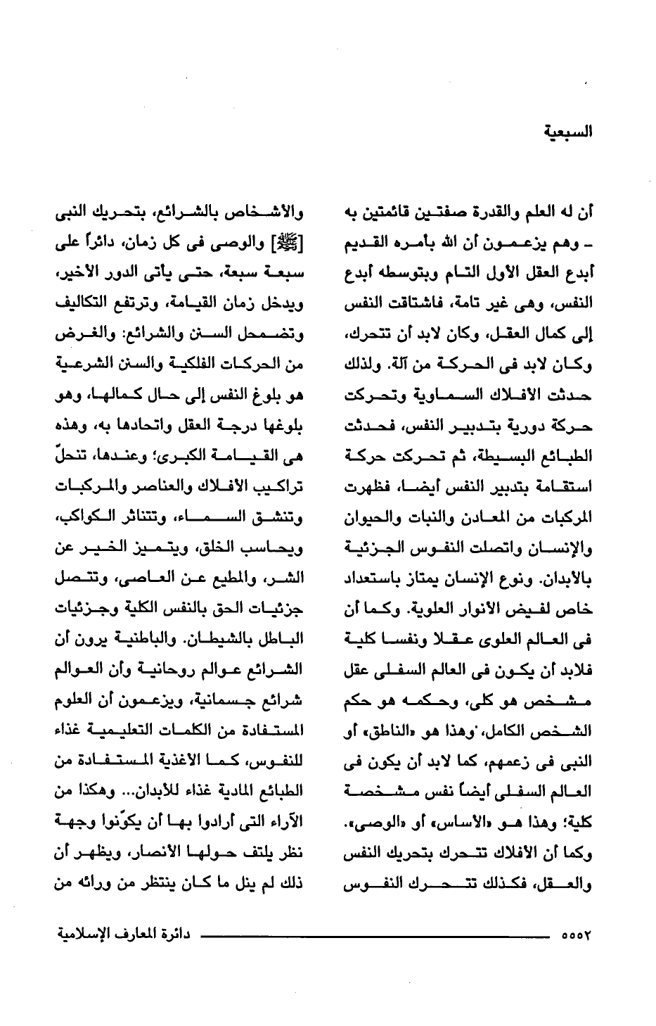 أن له العلم والقدرة صفتين قائمتين به -وهم يزعمون أن اللَّه بأمره القديم أبدع العقل الأول التام وبتوسطه أبدع النفس، وهى غير تامة، فاشتاقت النفس إلى كمال العقل، وكان لابد أن تتحرك، وكان لابد فى الحركة من آلة. ولذلك حدثت الأفلاك السماوية وتحركت حركة دورية بتدبير النفس، فحدثت الطبائع البسيطة، ثم تحركت حركة استقامة بتدبير النفس أيضا، فظهرت المركبات من المعادن والنبات والحيوان والإنسان واتصلت النفوس الجزئية بالأبدان. ونوع الإنسان يمتاز باستعداد خاص لفيض الأنوار العلوية. وكما أن فى العالم العلوى عقلا ونفسا كلية فلابد أن يكون فى العالم السفلى عقل مشخص هو كلى، وحكمه هو حكم الشخص الكامل، وهذا هو "الناطق" أو النبى فى زعمهم، كما لابد أن يكون فى العالم السفلى أيضًا نفس مشخصة كلية؛ وهذا هو "الأساس" أو "الوصى". وكما أن الأفلاك تتحرك بتحريك النفس والعقل، فكذلك تتحرك النفوس والأشخاص بالشرائع، بتحريك النبى [-صلى اللَّه عليه وسلم-] والوصى فى كل زمان، دائرًا على سبعة سبعة، حتى يأتى الدور الأخير، ويدخل زمان القيامة، وترتفع التكاليف وتضمحل السنن والشرائع: والغرض من الحركات الفلكية والسنن الشرعية هو بلوغ النفس إلى حال كمالها، وهو بلوغها درجة العقل واتحادها به، وهذه هى القيامة الكبرى؛ وعندها، تنحلّ تراكيب الأفلاك والعناصر والمركبات وتنشق السماء، وتتناثر الكواكب، ويحاسب الخلق، ويتميز الخير عن الشر، والمطيع عن العاصى، وتتصل جزئيات الحق بالنفس الكلية وجزئيات الباطل بالشيطان. والباطنية يرون أن الشرائع عوالم روحانية وأن العوالم شرائع جسمانية، ويزعمون أن العلوم المستفادة من الكلمات التعليمية غذاء للنفوس، كما الأغذية المستفادة من الطبائع المادية غذاء للأبدان. . . وهكذا من الآراء التى أرادوا بها أن يكوّنوا وجهة نظر يلتف حولها الأنصار، ويظهر أن ذلك لم ينل ما كان ينتظر من ورائه من